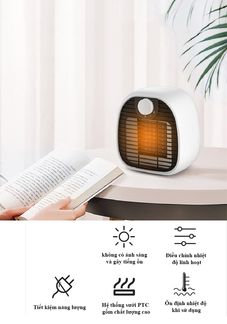 Thiết kế nhỏ gọn, tiện dụng Sưởi ấm nhanh, không gây tiếng ồn 3 mức phát nhiệt Có tính năng quay đảo hướng phát nhiệt, phạm vi phát nhiệt rộng Lưới tản nhiệt thiết kế