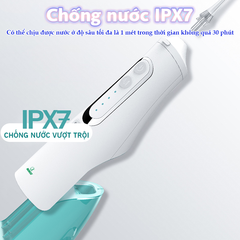 - Đầu cạo lưỡi: là loại vòi phun được thiết kế để làm sạch vùng lưỡi và giúp loại bỏ các tạp chất và vi khuẩn trên bề mặt lưỡi. Sử dụng vòi cạo lưỡi giúp giảm nguy cơ mùi hôi miệng. Bình chứa có dung tích cực lớn 310 ml Bình chứa của máy tăm nước vệ sinh răng Nikio NK-M209 có dung tích lớn cho phép người dùng sử dụng trong một khoảng thời gian dài mà không cần phải chăm nước liên tục. Với dung tích 310 ml, người dùng có thể sử dụng máy tăm nước trong thời gian khoảng 2 phút mà không cần phải tạm dừng để thay đổi nước. Điều này giúp tiết kiệm thời gian và đảm bảo tính hiệu quả của quá trình tăm nước vệ sinh răng. Chống nước mức độ vượt trội IPX7 Máy tăm nước vệ sinh răng Nikio NK-M209 có khả năng chống nước đến mức độ IPX7. Máy có thể chịu được nước ở độ sâu tối đa là 1 mét trong thời gian không quá 30 phút. Điều này giúp cho máy có thể sử dụng trong môi trường ẩm ướt mà không gây ra bất kỳ vấn đề gì. Với tính năng chống nước IPX7, bạn có thể hoàn toàn yên tâm khi sử dụng máy tăm nước Nikio NK-M209 trong môi trường ẩm ướt như khi tắm, rửa mặt hoặc vệ sinh răng miệng. Tính năng này cũng giúp cho việc làm sạch và bảo quản máy tăm nước trở nên dễ dàng hơn. Pin sạc dung lượng 1500mAh Máy tăm nước vệ sinh răng Nikio NK-M209 được trang bị pin sạc dung lượng 1500mAh. Người dùng có thể sử dụng máy tăm nước trong khoảng thời gian dài trước khi cần sạc lại pin. Pin sạc nhanh và tiện lợi với cáp sạc Type C. Thiết kế nhỏ gọn thuận tiện và đẹp mắt Máy tăm nước Nikio NK-M209 có một thiết kế nhỏ gọn giúp người dùng dễ dàng mang theo và sử dụng bất cứ khi nào cần thiết. Sản phẩm được thiết kế tinh tế và hiện đại, với màu sắc trang nhã và kiểu dáng đơn giản. Điều này giúp máy tăm nước trở thành một phụ kiện vệ sinh răng miệng không chỉ hữu ích mà còn tạo thêm giá trị thẩm mỹ cho người dùng. Tại sao nên sử dụng máy tăm nuớc Nikio NK-M209: