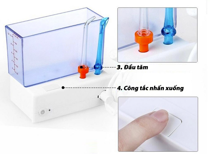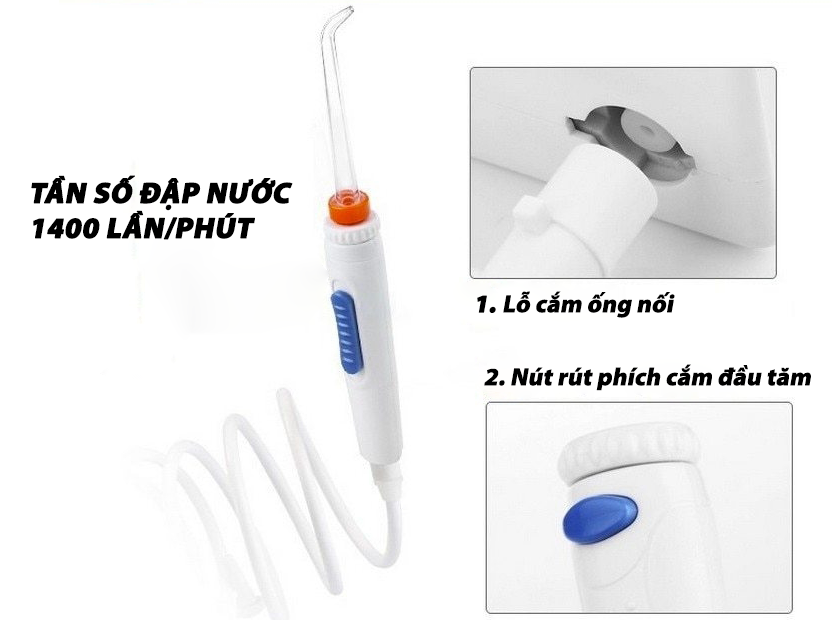 – Số đầu tăm kèm theo máy: 5 (2 đầu tiêu chuẩn, 1 đầu nội nha, 1 đầu chỉnh nha, 1 đầu chải lưỡi)