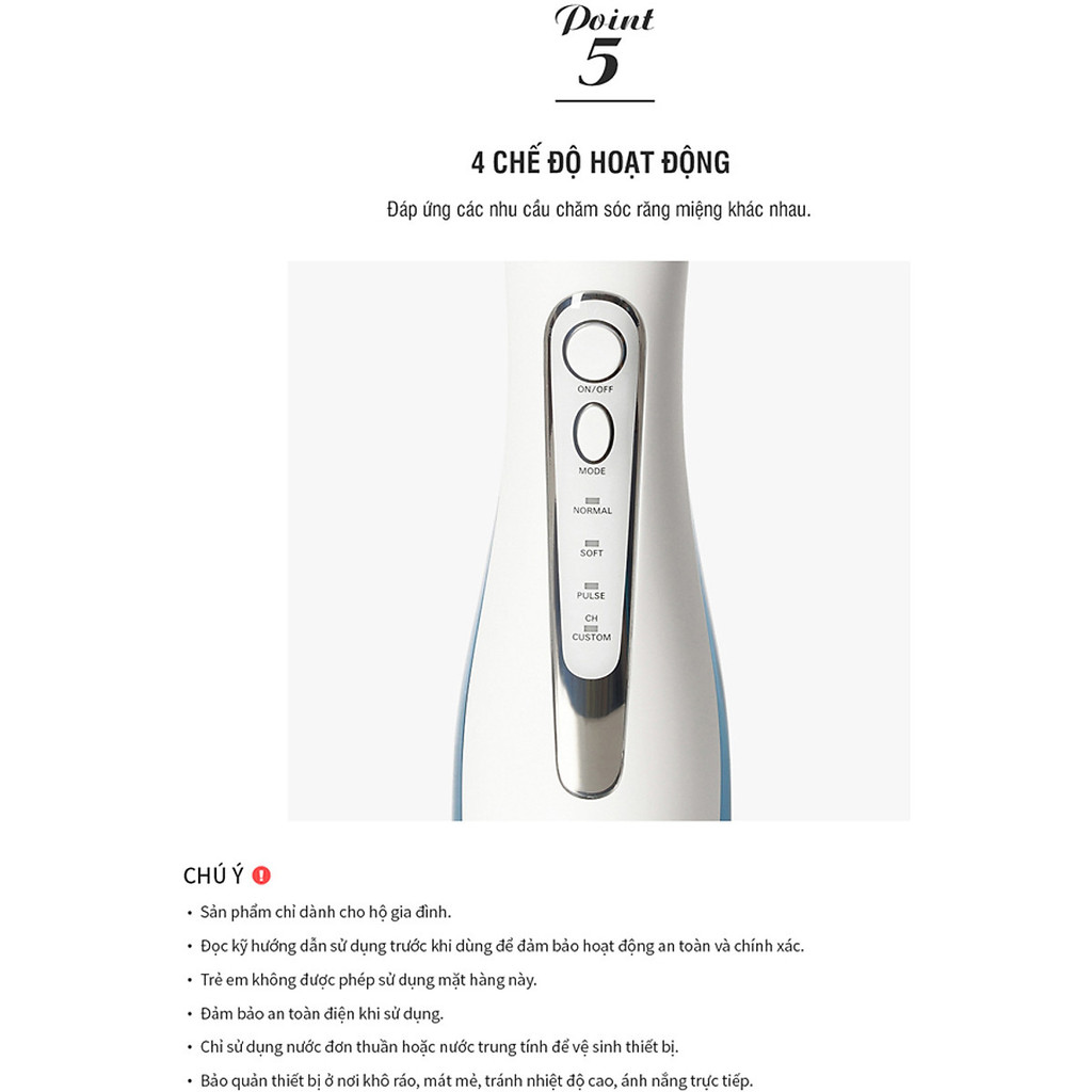 Làm sạch hiệu quả: Tia nước nhẹ nhàng giúp loại bỏ đến 99,9% mảng bám, ngay cả ở những khu vực mà bàn chải thông thường khó tiếp cận. 5 mức điều chỉnh áp lực