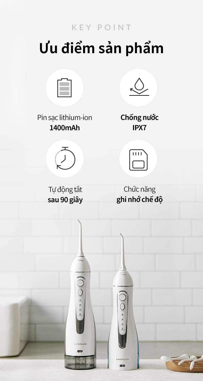 Được tích hợp pin lithium 1400mAh, tăm nước có thể sử dụng lên đến 20 ngày.