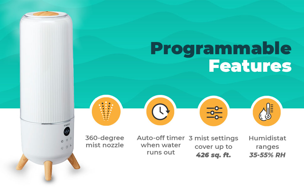 Máy tạo ẩm siêu âm khử khuẩn TotalComfort Deluxe HOMEDICS UHE-CMTF90 (cài đặt độ ẩm trong phòng) Dễ dàng tháo và đổ đầy bình 5,6L Vòi phun tùy chỉnh xoay 360 độ Chạy tới 70
