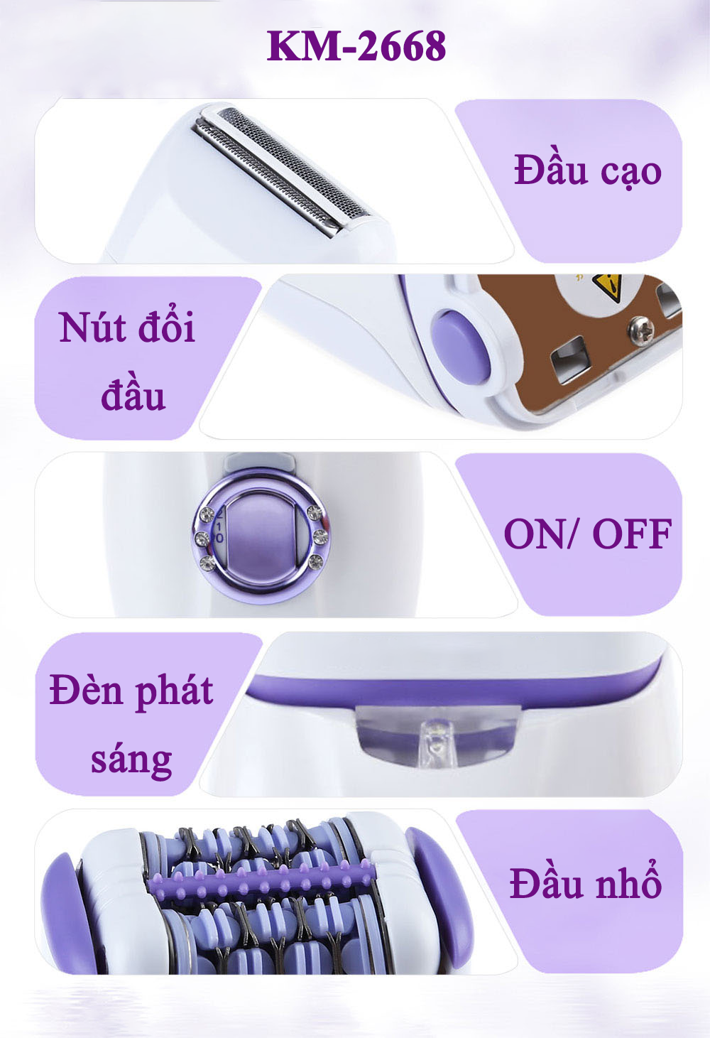 - Một chiếc máy tẩy lông đã không còn quá xa lạ với chị em phụ nữ nữa - Không chỉ giúp chị em có làn da mịn màn hơn mà còn giúp chị em trở nên tự tin khi diện những bộ trang phục quyến rủ Kemei-2668 là máy nhổ, cạo lông thông mình với 2 đầu thay thế linh hoạt
