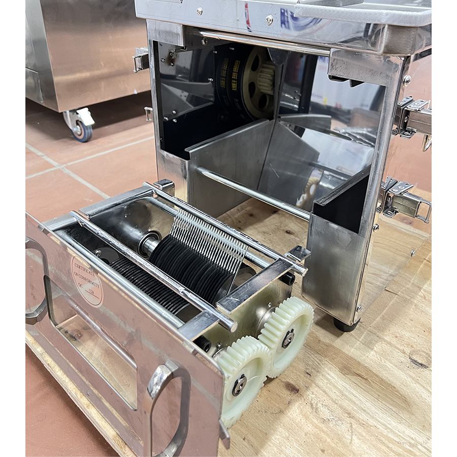 Máy có thể dễ dàng thay đổi kích cỡ. 4 cỡ dao có thể thay đổi bao gồm: 2mm - 2.5mm - 3.5mm hoặc 5mm. Cỡ dao mỏng nhất 2mm rất thích hợp cho các khách bán phở bò, bún bò quy mô nhỏ.