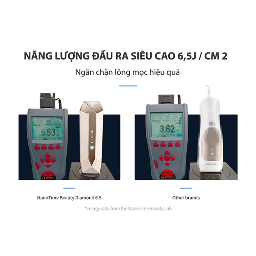 Sử dụng công nghệ IPL - với mức năng lượng lên đến 6.5J/cm2, cao nhất trên thị trường hiện tại. Năng lượng càng cao nang lông càng bị phá hủy triệt để, hạn chế việc lông mọc trở lại hiệu quả.