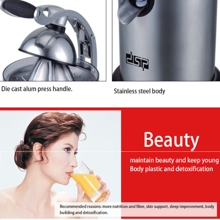 Máy vắt cam DSP thiết kế đơn sang trọng và tiện ích, thích hợp dùng để vắt lấy nước các loại trái cây như cam, quýt, chanh…