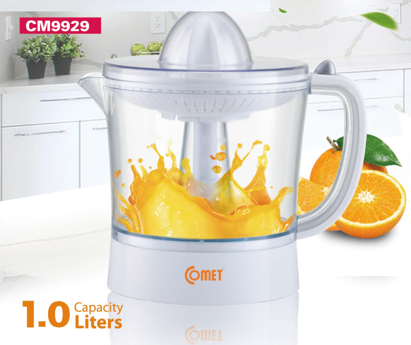 THÔNG TIN KỸ THUẬT: 1.Thương hiệu : Comet 2.Sản phẩm : Máy vắt cam 3.Mã sản phẩm : CM9929 4.Điện áp : 220V - 50Hz 5.Công suất: 40W 6.Dung tích: 1000ml 7.Kích thước : 185150208 mm – cân nặng : 0.5 kg 8.Xuất xứ : Trung Quốc. MÔ TẢ :