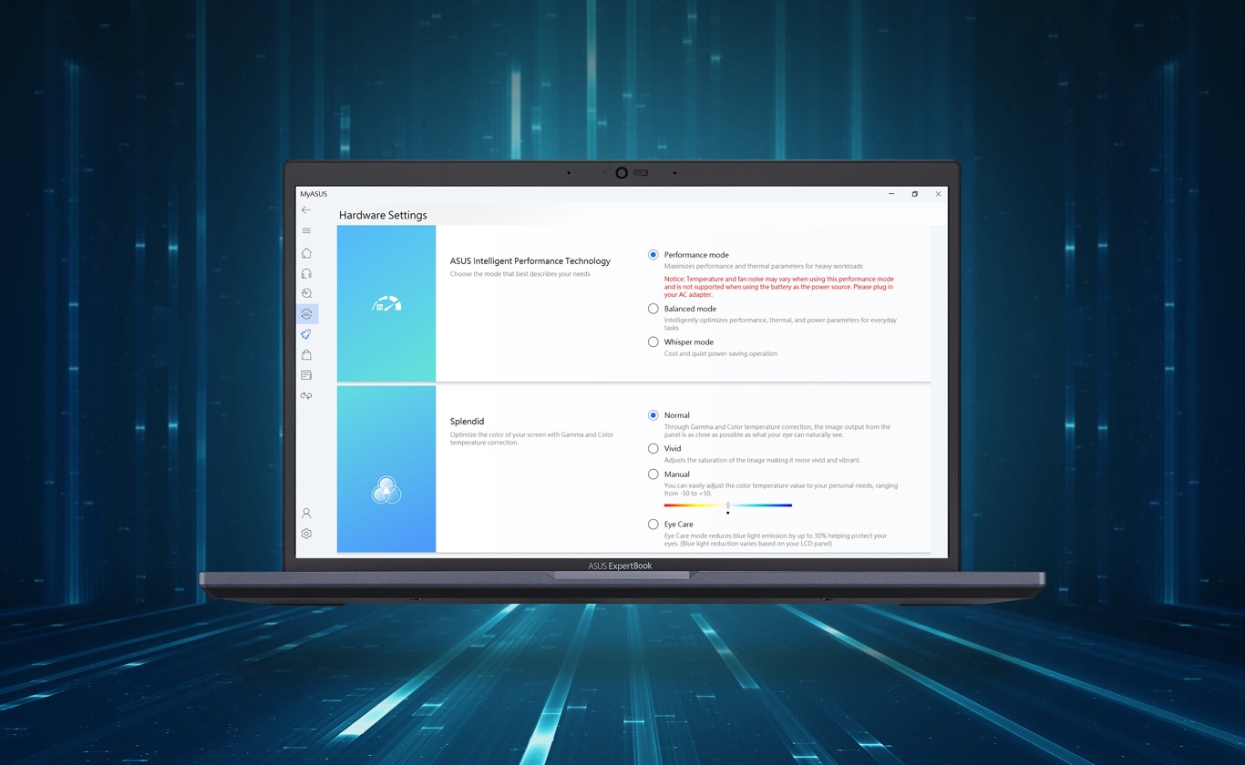 Công nghệ Hiệu năng Thông minh của ASUS nằm ở thiết kế tản nhiệt siêu hiệu quả và giải pháp tiết kiệm điện năng. Công nghệ sử dụng các thuật toán độc quyền của ASUS kết hợp với năm4 cảm biến thông minh, thiết kế khí động học và bộ nguồn lên tới 90-watt (tùy chọn thêm) nhằm tăng cường hiệu năng CPU một cách thông minh với độ ổn định được cải thiện, tạo nên một chiếc máy tính xách tay mát mẻ và bớt ồn hơn. Với công nghệ Hiệu năng Thông minh của ASUS, ExpertBook B1 sẽ mang lại hiệu năng tối đa theo nhu cầu sử dụng của bạn.