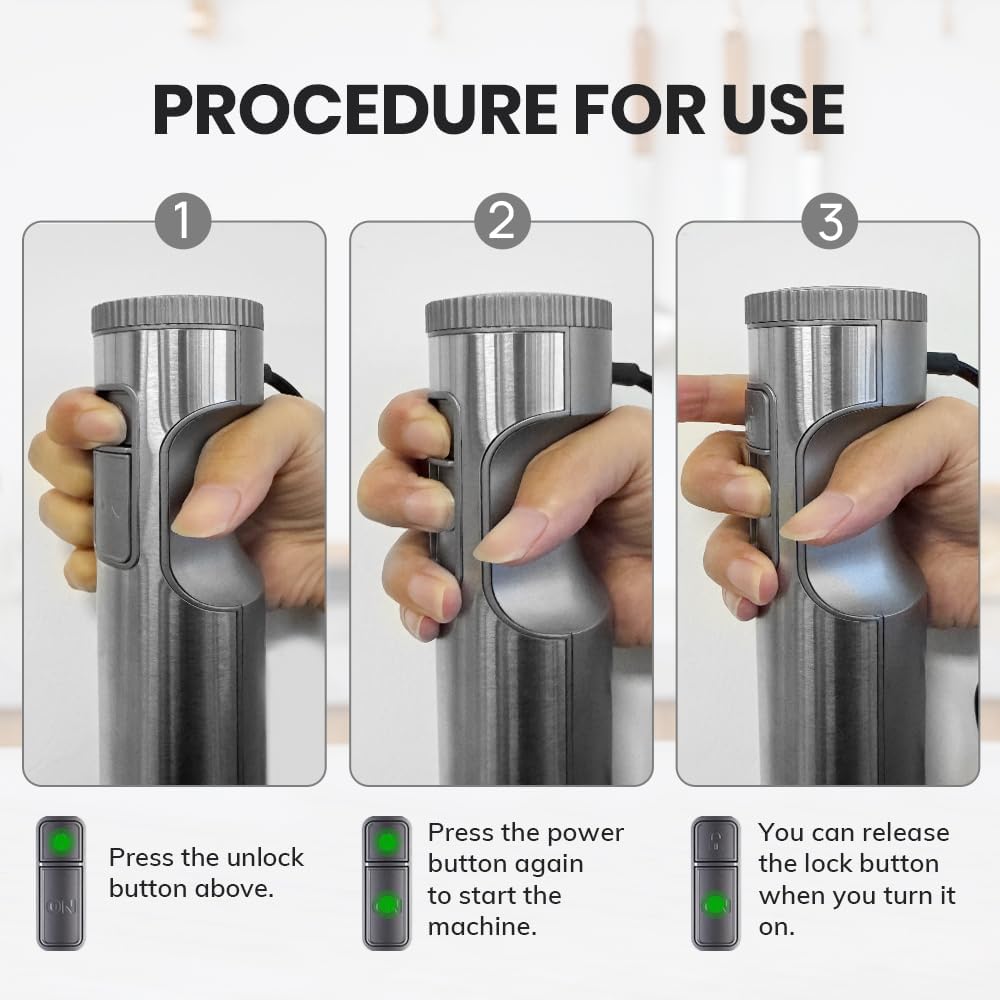Thông tin cảnh báo: • Không nên sử dụng thiết bị nếu dây điện, phích cắm hoặc những bộ phận khác bị hỏng. • Không sử dụng cối xay hoặc cốc nghiền để bật hoặc