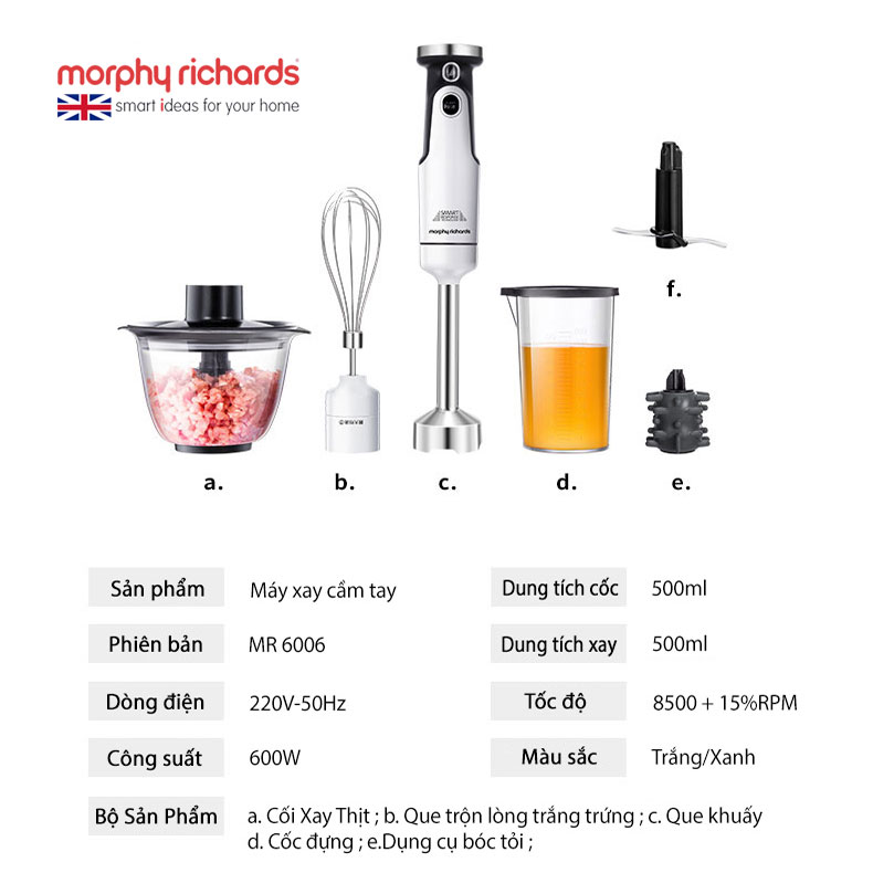 Mua tại TiktokGiới thiệu sản phẩm Một gian bếp hiện đại với không gian thoải mái, luôn cần những thiết bị nội trợ đi kèm Morphy Richards - một thương hiệu gia dụng lớn đến từ Anh Quốc chuyên gia trong thiết bị gia dụng nhà bếp. Máy xay cầm tay Morphy Richards MR6006 thiết kế nhỏ gọn, tiện dụng giúp chị em nội trợ nấu nướng, chế biến được đa dạng các món ăn khác nhau hơn với 4 chức năng trong 1 chiếc máy.