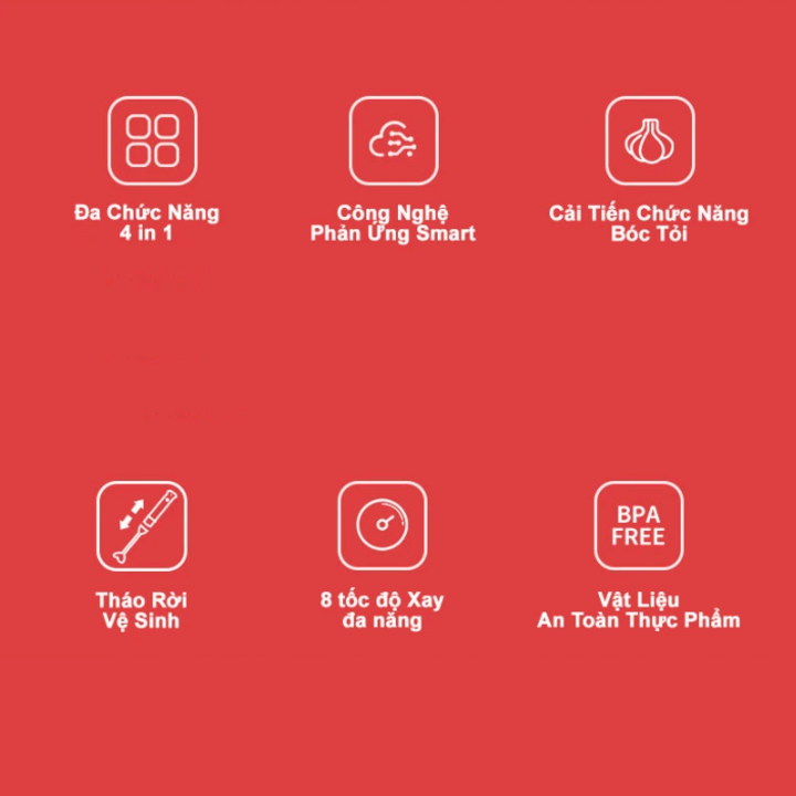 - Bộ sản phẩm bao gồm: Bộ sản phẩm bao gồm 1 thân máy xay; 1 đầu xay sinh tố, thực phẩm mềm; 2 cốc xay; 1 bộ dụng cụ xay thịt, 1 dụng cụ đánh trứng và 1 dụng cụ bóc tỏi