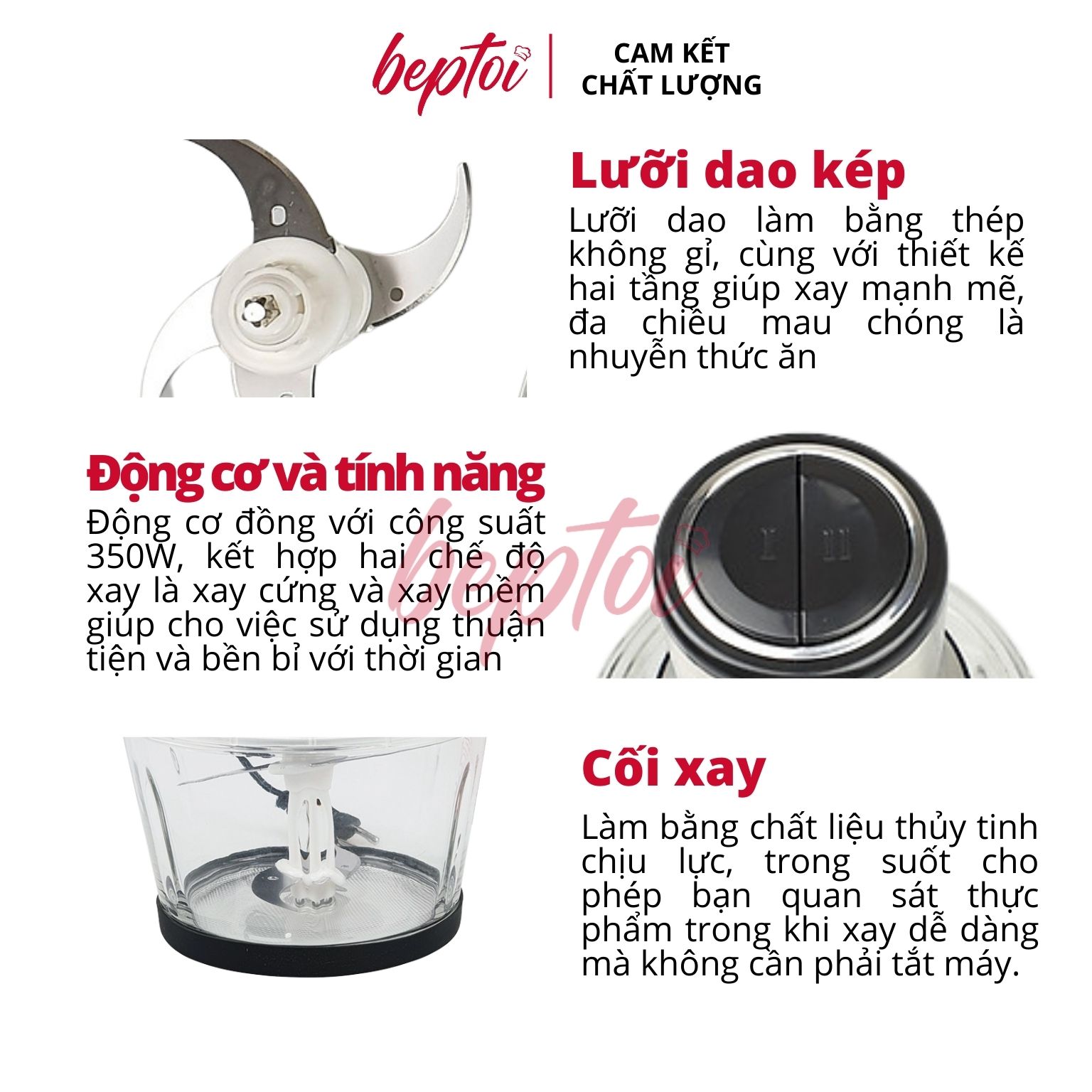 Công suất: 300 W - Chức năng chính: + Xay gia vị: Hành, tỏi, ớt, hạt ngũ cốc +Xay thịt - Cối xay: 1 cối xay thịt 2 L - Chất liệu cối chính: Cối
