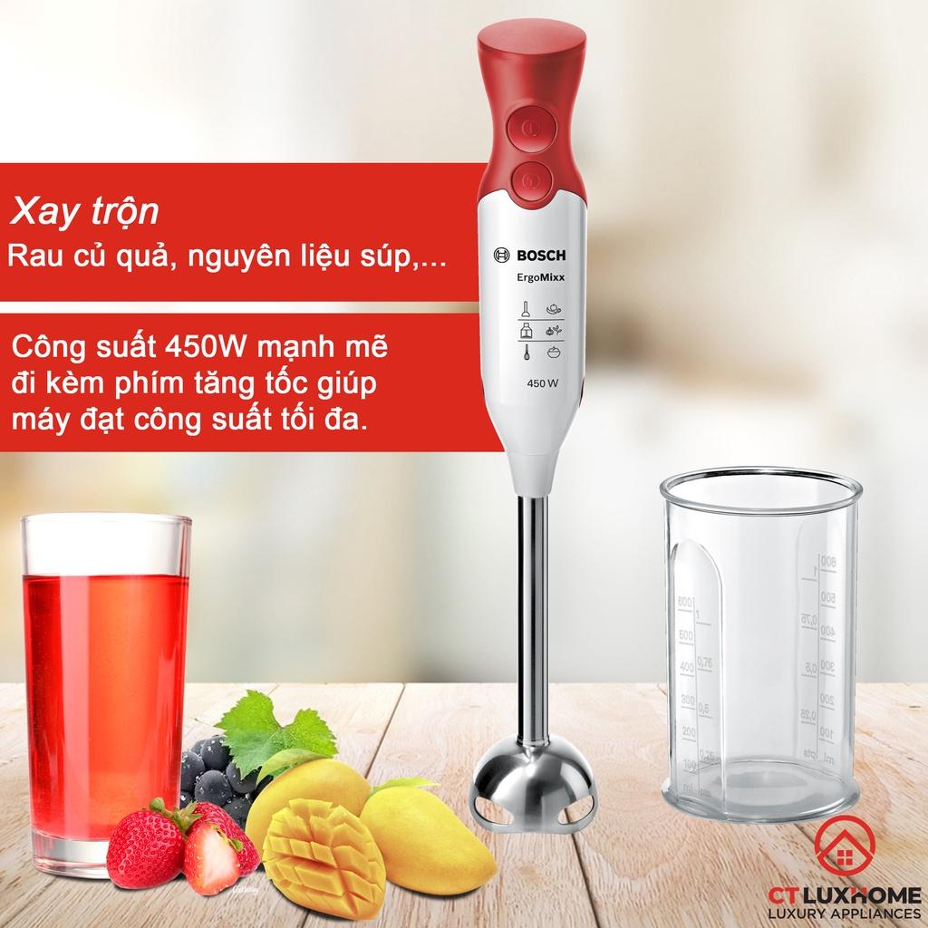 Máy xay sinh tố Bosch thiết kế dạng cầm tay nhỏ gọn, sử dụng linh hoạt, phục vụ hiệu quả trong không gian bếp núc gia đình, có thể xay nghiền trực tiếp thực phẩm trong ly, tô... rất tiện lợi Thiết kế hiện đại, sang trọng, tay cầm chất liệu êm, mềm, vừa vặn dễ cầm nắm, chống trượt giúp thao tác nhanh gọn và chắc chắn.   Máy xay sinh tố đa năng với công suất 450 W mạnh mẽ, xay nhanh, tạo độ ồn thấp, đảm bảo không gian dễ chịu khi sử dụng Chân trộn bằng thép không gỉ sắc bén xay trộn tốt, nghiền hiệu quả, không làm đổi màu và vị của nguyên liệu mang xay Thiết kế chống rung lắc tạo thế chắc chắn và linh hoạt khi thao tác, có thể tháo rời vệ sinh dễ dàng. Máy xay sinh tố có cốc xay kết hợp ly đựng có vạch đo nguyên liệu tiện dụng, chất liệu nhựa cao cấp an toàn sức khỏe, kháng vỡ, bền tốt, dễ làm sạch Sử dụng đơn giản với 2 nút nhấn chỉnh tốc độ xay trên tay cầm