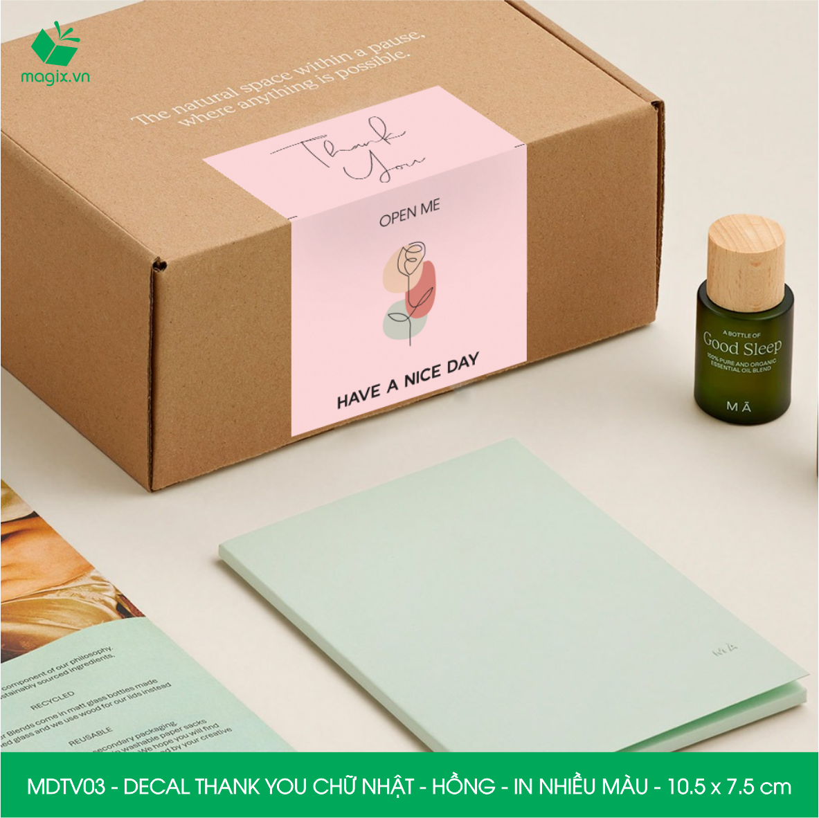 Decal - sticker Thank You là loại nhãn dán có nội dung "Cám ơn" được thiết kế theo hình chữ nhật. Decal Thank You thường được sử dụng để trang trí đóng gói thời trang,