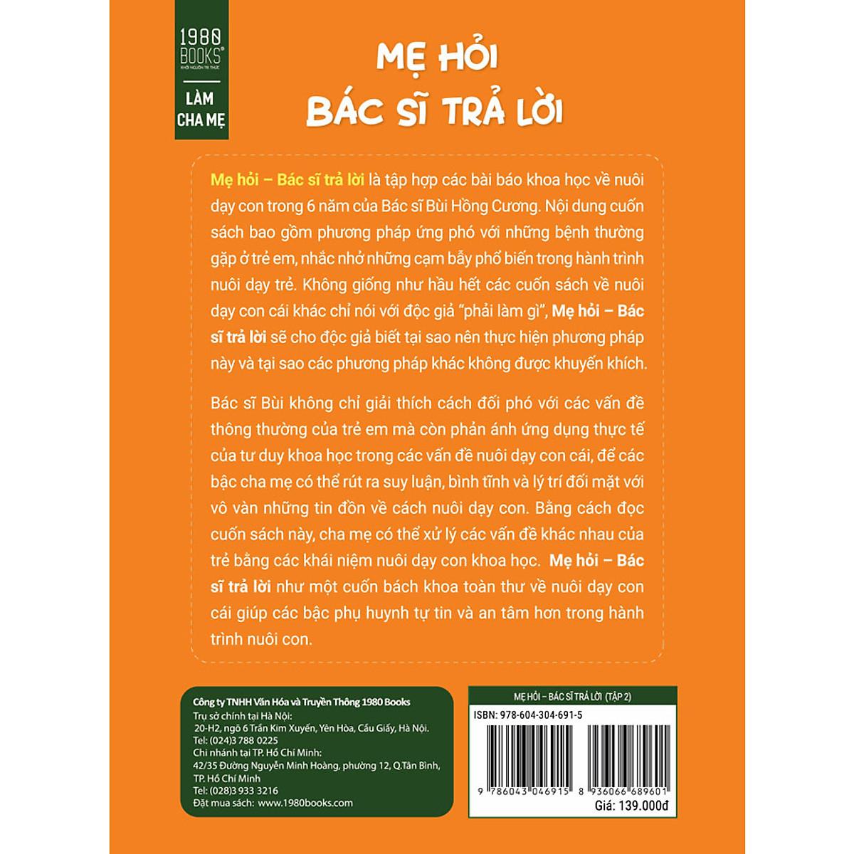 Mẹ hỏi – Bác sĩ trả lời là tập hợp các bài báo khoa học về nuôi dạy con trong 6 năm của bác sĩ Bùi Hồng Cương. Nội dung cuốn sách bao gồm phương pháp ứng phó với những bệnh thường gặp ở trẻ em, nhắc nhở những cặm bẫy phổ biến trong hành trình nuôi dạy trẻ.