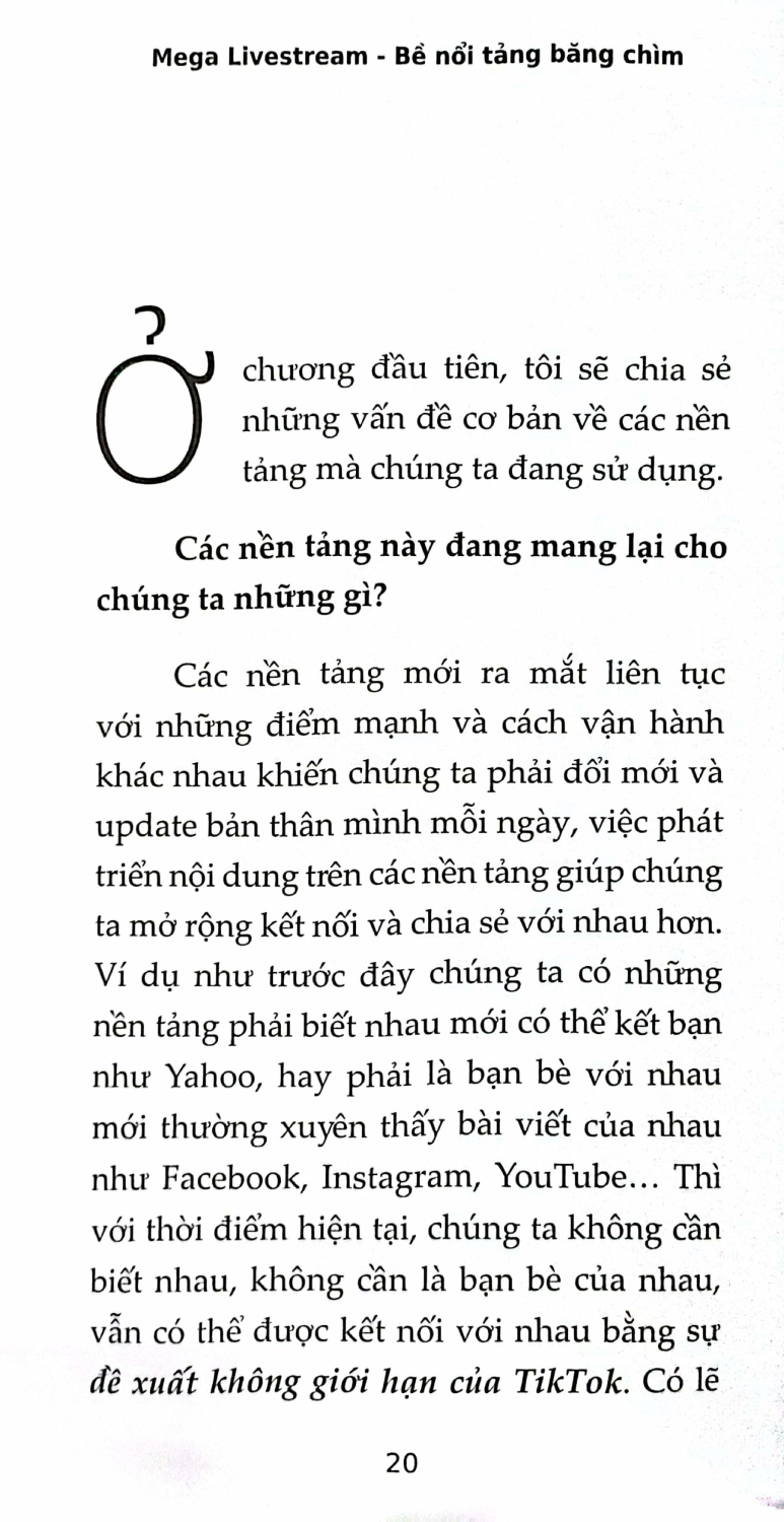 • Tất tần tật cơ hội phát triển, những thách thức về công việc KOL, KOC. Qua cuốn sách, người đọc sẽ có cái nhìn toàn diện hiện tượng khủng “Mega Livestream”. Với những ai có mong muốn theo đuổi công việc KOC và tham gia vào lĩnh vực này có thể đúc kết những kiến thức cần thiết, dựa trên những thứ mà mình đang có, những thứ mà mình muốn phát triển, biết bắt đầu từ đâu và nên đi như thế nào để không bỡ ngỡ trước một thị trường rộng lớn cơ hội và thách thức.