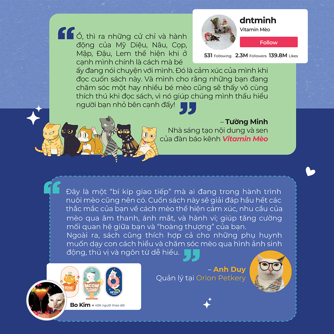 Anh Duy (Bo Kim) - Quản lý tại Orion Petkery: “Đây là một “bí kíp giao tiếp” mà ai đang trong hành trình nuôi mèo cũng nên có. Cuốn sách này sẽ giải đáp hầu hết các thắc mắc của bạn về cách mèo thể hiện cảm xúc, nhu cầu của mèo qua âm thanh, ánh mắt, và hành vi giúp tăng cường mối quan hệ giữa bạn và “hoàng thượng” của bạn.”