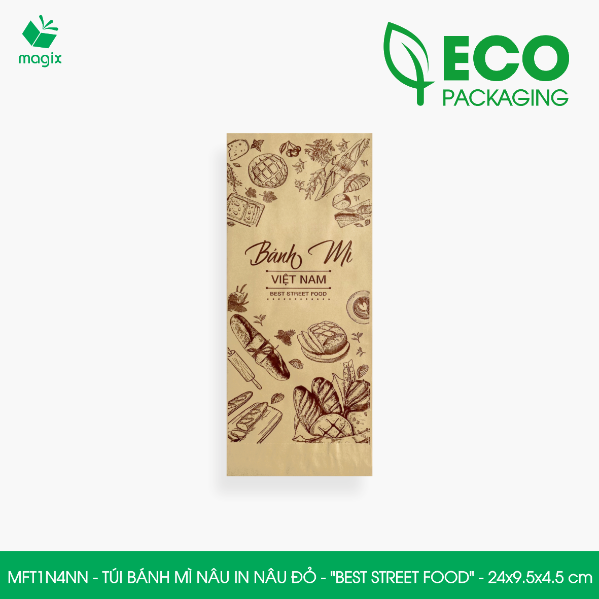 • MFT1N4X - Túi bánh mì nâu in xanh lá - "Best street food" - 24x9.5x4.5 cm