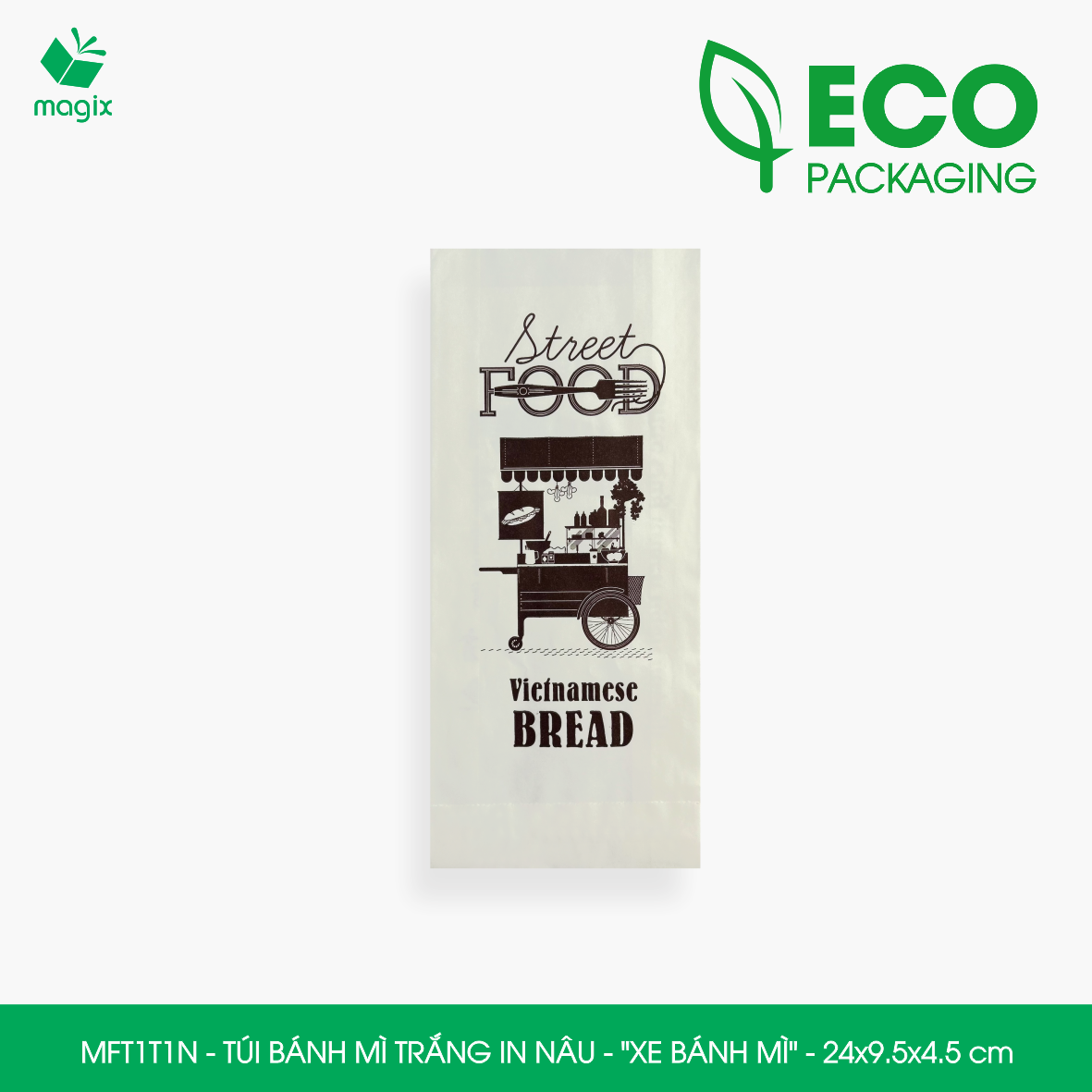 Thông tin sản phẩm: Túi giấy bánh mì MFT1A – Màu trắng chống thấm dầu Kích thước sản phẩm: 24 x 10 x 4 cm x 40gsm Quy cách đóng gói: 100 túi/pack Ưu điểm: