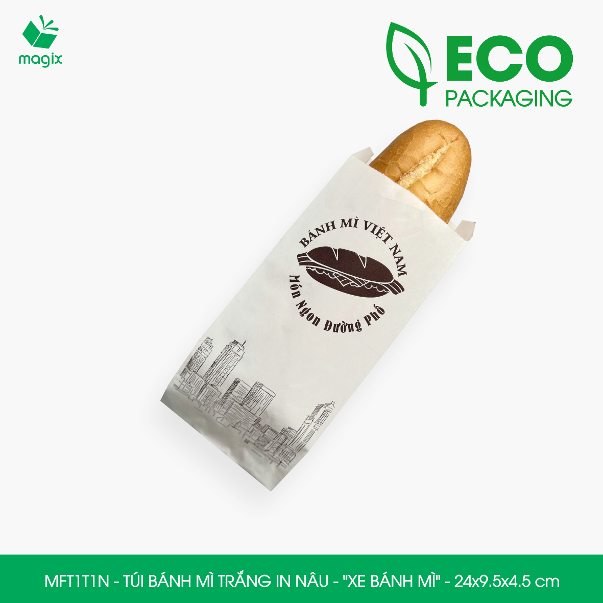 Thông tin sản phẩm: Túi giấy bánh mì MFT1A – Màu trắng chống thấm dầu Kích thước sản phẩm: 24 x 10 x 4 cm x 40gsm Quy cách đóng gói: 100 túi/pack Ưu điểm: