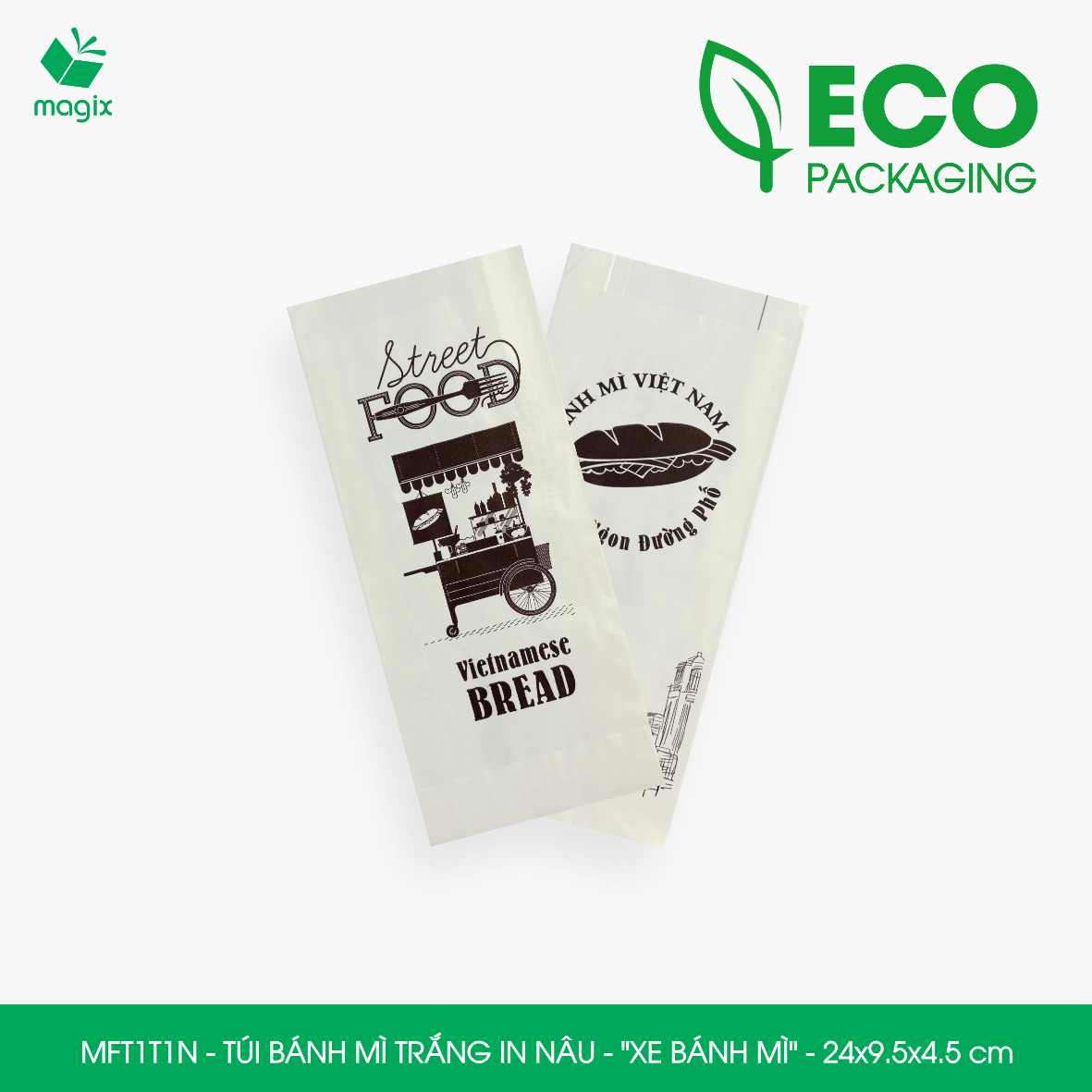 ĐẶC ĐIỂM SẢN PHẨM Chất liệu: Túi bánh mì in thường được làm từ giấy kraft nhật định lượng 50gsm thấm dầu có giấy chứng nhận FDA đảm bảo vệ sinh an toàn thực phầm Thiết kế: Miệng túi thiết kế chia thành 2 lớp dễ dàng thao tác bỏ bánh mì vào túi, đơn giản và tiện dụng CÔNG DỤNG Tiện lợi: Bảo vệ bánh mì khỏi bụi bẩn, môi trường ô nhiễm, tác động từ bên ngoài và tránh làm dơ tay khi sử dụng Quảng cáo thương hiệu: Túi bánh mì in được sử dụng như một phương tiện quảng cáo nhỏ gọn và hiệu quả, với thiết kế in ấn logo, thông tin về sản phẩm và các thông điệp quảng cáo khác Bảo vệ môi trường: Túi bánh mì được làm từ chất liệu giấy kraft nguyên sinh, giúp giảm thiểu lượng rác thải nhựa và bảo vệ môi trường Tiết kiệm chi phí: Túi giấy bánh mì có giá thành thấp hơn so với các loại bao bì khác như hộp giấy, hộp nhựa đựng bánh mì TIÊU CHUẨN KỸ THUẬT Chất liệu: Giấy Kraft chuyên dùng cho thực phẩm đạt tiêu chuẩn FDA Định lượng: 50gsm Mã hàng - Kiểu in - Kích thước • MFT1N5NN - Túi bánh mì nâu in nâu - "Giỏ bánh mì" - 24x9.5x4.5 cm • MFT1T5N - Túi bánh mì trắng in nâu - "Giỏ bánh mì" - 24x9.5x4.5 cm • MFT1N4X - Túi bánh mì nâu in xanh lá - "Best street food" - 24x9.5x4.5 cm • MFT1T4X - Túi bánh mì trắng in xanh lá - "Best street food" - 24x9.5x4.5 cm • MFT1N4NN - Túi bánh mì nâu in nâu đỏ - "Best street food" - 24x9.5x4.5 cm • MFT1T4N - Túi bánh mì trắng in nâu - "Best street food" - 24x9.5x4.5 cm • MFT1T3C - Túi bánh mì trắng in cam - "Đầu bếp" - 24x9.5x4.5 cm • MFT1N3NN - Túi bánh mì nâu in nâu đỏ - "Đầu bếp" - 24x9.5x4.5 cm • MFT1T3NN - Túi bánh mì trắng in nâu đỏ - "Đầu bếp" - 24x9.5x4.5 cm • MFT1N2NN - Túi bánh mì nâu in nâu đỏ - "Cối xay gió" - 24x9.5x4.5 cm • MFT1T2N - Túi bánh mì trắng in nâu - "Cối xay gió" - 24x9.5x4.5 cm • MFT1N1NN - Túi bánh mì nâu in nâu đỏ - "Xe bánh mì" - 24x9.5x4.5 cm • MFT1T1N - Túi bánh mì trắng in nâu - "Xe bánh mì" - 24x9.5x4.5 cm LƯU Ý Bảo quản sản phẩm nơi khô ráo, sạch sẽ tránh tiếp xúc trực tiếp với ánh nắng mặt trời và nhiệt độ cao.