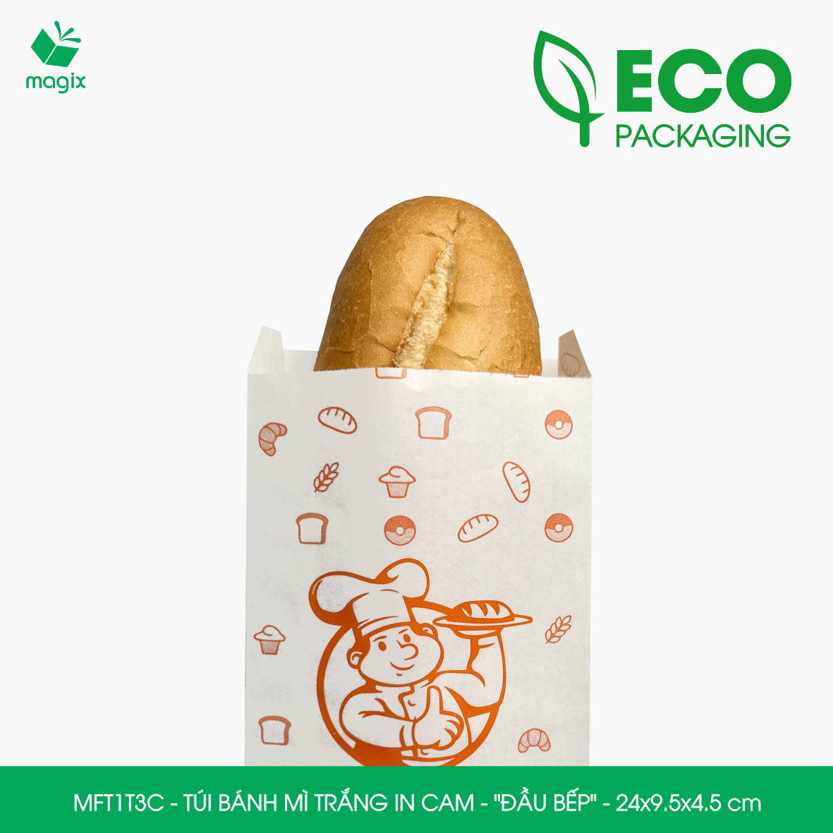 ĐẶC ĐIỂM SẢN PHẨM Chất liệu: Túi bánh mì in thường được làm từ giấy kraft nhật định lượng 50gsm thấm dầu có giấy chứng nhận FDA đảm bảo vệ sinh an toàn thực phầm Thiết kế: Miệng túi thiết kế chia thành 2 lớp dễ dàng thao tác bỏ bánh mì vào túi, đơn giản và tiện dụng    CÔNG DỤNG Tiện lợi: Bảo vệ bánh mì khỏi bụi bẩn, môi trường ô nhiễm, tác động từ bên ngoài và tránh làm dơ tay khi sử dụng Quảng cáo thương hiệu: Túi bánh mì in được sử dụng như một phương tiện quảng cáo nhỏ gọn và hiệu quả, với thiết kế in ấn logo, thông tin về sản phẩm và các thông điệp quảng cáo khác Bảo vệ môi trường: Túi bánh mì được làm từ chất liệu giấy kraft nguyên sinh, giúp giảm thiểu lượng rác thải nhựa và bảo vệ môi trường Tiết kiệm chi phí: Túi giấy bánh mì có giá thành thấp hơn so với các loại bao bì khác như hộp giấy, hộp nhựa đựng bánh mì   TIÊU CHUẨN KỸ THUẬT Chất liệu: Giấy Kraft chuyên dùng cho thực phẩm đạt tiêu chuẩn FDA  Định lượng: 50gsm Mã hàng - Kiểu in - Kích thước  • MFT1N5NN - Túi bánh mì nâu in nâu - "Giỏ bánh mì" - 24x9.5x4.5 cm  • MFT1T5N - Túi bánh mì trắng in nâu - "Giỏ bánh mì" - 24x9.5x4.5 cm  • MFT1N4X - Túi bánh mì nâu in xanh lá - "Best street food" - 24x9.5x4.5 cm  • MFT1T4X - Túi bánh mì trắng in xanh lá - "Best street food" - 24x9.5x4.5 cm  • MFT1N4NN - Túi bánh mì nâu in nâu đỏ - "Best street food" - 24x9.5x4.5 cm  • MFT1T4N - Túi bánh mì trắng in nâu - "Best street food" - 24x9.5x4.5 cm  • MFT1T3C - Túi bánh mì trắng in cam - "Đầu bếp" - 24x9.5x4.5 cm  • MFT1N3NN - Túi bánh mì nâu in nâu đỏ - "Đầu bếp" - 24x9.5x4.5 cm  • MFT1T3NN - Túi bánh mì trắng in nâu đỏ - "Đầu bếp" - 24x9.5x4.5 cm  • MFT1N2NN - Túi bánh mì nâu in nâu đỏ - "Cối xay gió" - 24x9.5x4.5 cm  • MFT1T2N - Túi bánh mì trắng in nâu - "Cối xay gió" - 24x9.5x4.5 cm  • MFT1N1NN - Túi bánh mì nâu in nâu đỏ - "Xe bánh mì" - 24x9.5x4.5 cm  • MFT1T1N - Túi bánh mì trắng in nâu - "Xe bánh mì" - 24x9.5x4.5 cm   LƯU Ý Bảo quản sản phẩm nơi khô ráo, sạch sẽ tránh tiếp xúc trực tiếp với ánh nắng mặt trời và nhiệt độ cao.