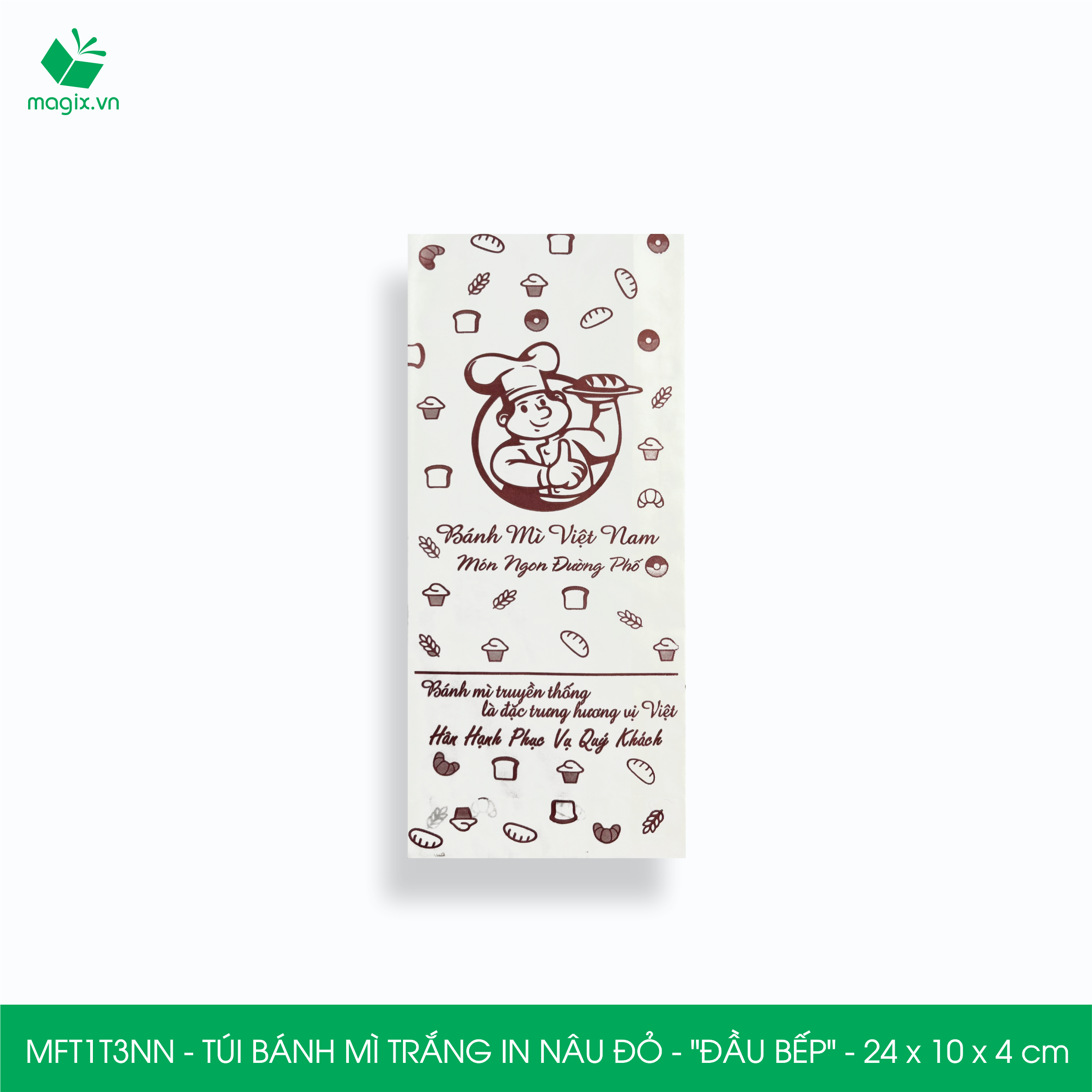 ĐẶC ĐIỂM SẢN PHẨM Chất liệu: Túi bánh mì in thường được làm từ giấy kraft nhật định lượng 50gsm thấm dầu có giấy chứng nhận FDA đảm bảo vệ sinh an toàn thực phầm Thiết kế: Miệng túi thiết kế chia thành 2 lớp dễ dàng thao tác bỏ bánh mì vào túi, đơn giản và tiện dụng    CÔNG DỤNG Tiện lợi: Bảo vệ bánh mì khỏi bụi bẩn, môi trường ô nhiễm, tác động từ bên ngoài và tránh làm dơ tay khi sử dụng Quảng cáo thương hiệu: Túi bánh mì in được sử dụng như một phương tiện quảng cáo nhỏ gọn và hiệu quả, với thiết kế in ấn logo, thông tin về sản phẩm và các thông điệp quảng cáo khác Bảo vệ môi trường: Túi bánh mì được làm từ chất liệu giấy kraft nguyên sinh, giúp giảm thiểu lượng rác thải nhựa và bảo vệ môi trường Tiết kiệm chi phí: Túi giấy bánh mì có giá thành thấp hơn so với các loại bao bì khác như hộp giấy, hộp nhựa đựng bánh mì   TIÊU CHUẨN KỸ THUẬT Chất liệu: Giấy Kraft chuyên dùng cho thực phẩm đạt tiêu chuẩn FDA  Định lượng: 50gsm Mã hàng - Kiểu in - Kích thước  • MFT1N5NN - Túi bánh mì nâu in nâu - "Giỏ bánh mì" - 24x9.5x4.5 cm  • MFT1T5N - Túi bánh mì trắng in nâu - "Giỏ bánh mì" - 24x9.5x4.5 cm  • MFT1N4X - Túi bánh mì nâu in xanh lá - "Best street food" - 24x9.5x4.5 cm  • MFT1T4X - Túi bánh mì trắng in xanh lá - "Best street food" - 24x9.5x4.5 cm  • MFT1N4NN - Túi bánh mì nâu in nâu đỏ - "Best street food" - 24x9.5x4.5 cm  • MFT1T4N - Túi bánh mì trắng in nâu - "Best street food" - 24x9.5x4.5 cm  • MFT1T3C - Túi bánh mì trắng in cam - "Đầu bếp" - 24x9.5x4.5 cm  • MFT1N3NN - Túi bánh mì nâu in nâu đỏ - "Đầu bếp" - 24x9.5x4.5 cm  • MFT1T3NN - Túi bánh mì trắng in nâu đỏ - "Đầu bếp" - 24x9.5x4.5 cm  • MFT1N2NN - Túi bánh mì nâu in nâu đỏ - "Cối xay gió" - 24x9.5x4.5 cm  • MFT1T2N - Túi bánh mì trắng in nâu - "Cối xay gió" - 24x9.5x4.5 cm  • MFT1N1NN - Túi bánh mì nâu in nâu đỏ - "Xe bánh mì" - 24x9.5x4.5 cm  • MFT1T1N - Túi bánh mì trắng in nâu - "Xe bánh mì" - 24x9.5x4.5 cm   LƯU Ý Bảo quản sản phẩm nơi khô ráo, sạch sẽ tránh tiếp xúc trực tiếp với ánh nắng mặt trời và nhiệt độ cao.