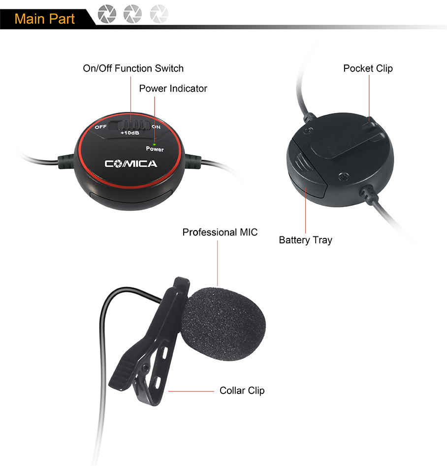 Comica CVM-Sig.lav V03 là micro cài áo có tính năng kiểm âm trực tiếp, đèn led hiển thị tình trạng pin và micro chống nhiễu đặc biệt, ngoài ra CVM-Sig.lav V03 còn có thể sử dụng với các dòng camera action qua dây kết nối TRS-mini usb đi kèm trong bộ sản phẩm.