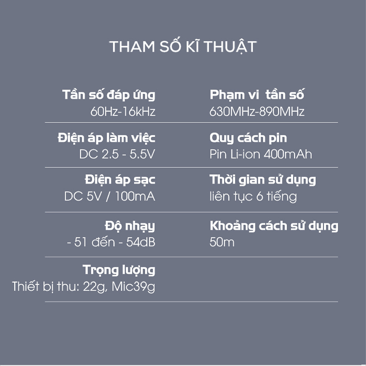 THÔNG SỐ KỸ THUẬT: - Công tắc Bật / tắt để điều khiển hoạt động của micrô - Bộ chuyển đổi chân đế để gắn vào giá đỡ micrô - Túi dây kéo để bảo