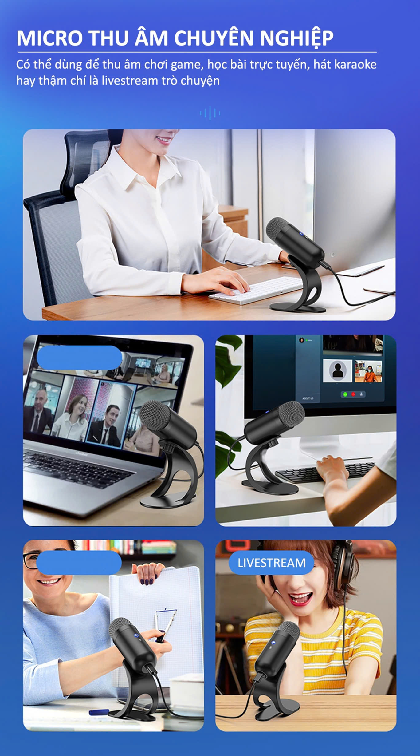 Chỉ cần cắm nó vào cổng usb của máy tính và bạn có thể sử dụng micrô này. Đặt âm lượng micrô của bạn thông qua phần mềm trò chuyện trực tiếp hoặc trò chuyện bằng giọng nói, bạn có thể bắt đầu phát sóng trực tiếp hoặc gọi ngay.