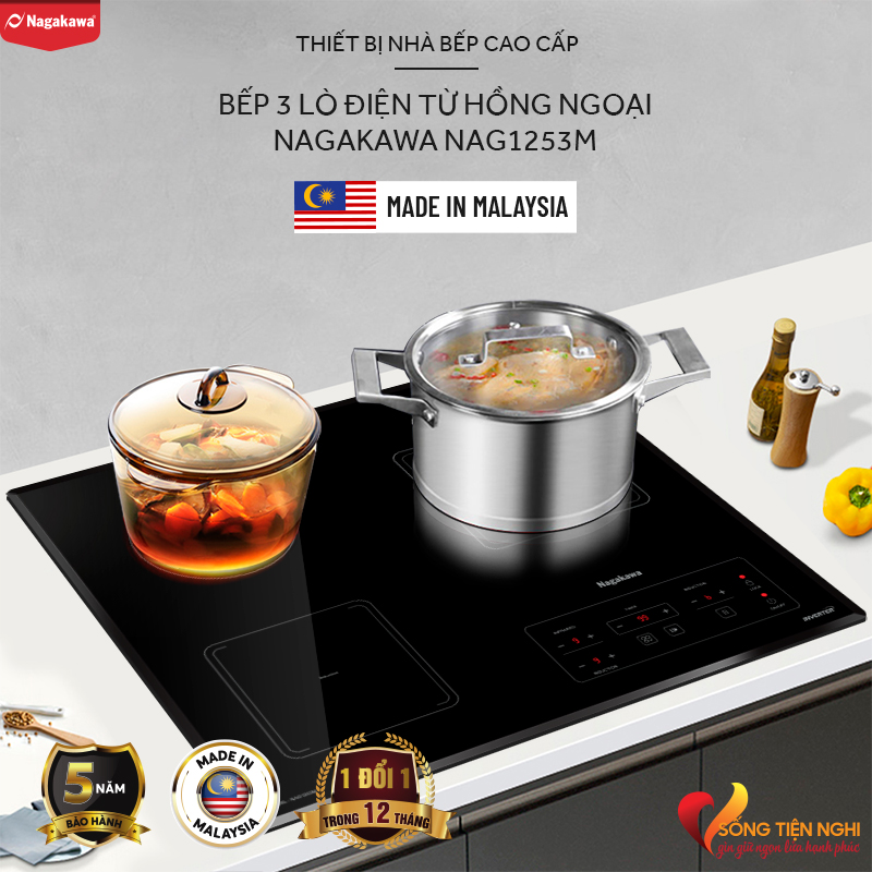 Bếp 3 lò điện từ hồng ngoại Inverter Nagakawa NAG1253M được sản xuất và nhập khẩu từ Malaysia. Bếp có 2 vùng nấu từ và 1 vùng nấu hồng ngoại với các mức công suất khác nhau giúp người nội trợ thỏa sức chế biến thực phẩm từ chiên, xào, ràn, hầm, luộc hấp. Đặc biệt, bếp còn đem đến trải nghiệm nấu ăn thoái mái, đầy hứng khởi bằng nhiều tính năng an toàn thông minh.
