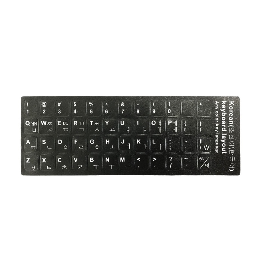 Miếng dán bàn phím tiếng hàn hay còn gọi là miếng dán phông chữ tiếng hàn, tấm dán chữ tiếng hàn. miếng dán được thiết kế dựa trên bảng mã kí tự tiêng hàn và chữ latinh. Sản phẩm được in thành một khuôn tạo thành hình chữ nhật chứa các kí tự tiếng Hàn tách rồi.