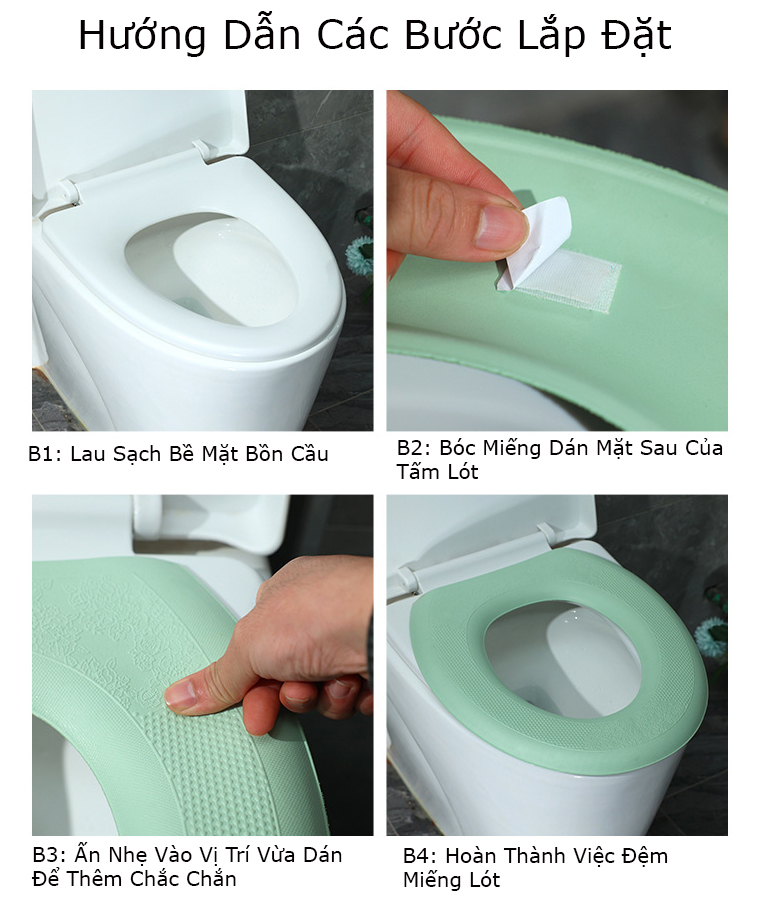 - Miếng Lót Bồn Cầu Giữ Ấm KUNBE là sản phẩm cần thiết cho gia đình bạn trong những ngày đông giá lạnh, thích hợp gia đình có trẻ nhỏ và người già. Các Bước Lắp Đặt: B1: lau sạch bề mặt của bồn cầu. B2: bóc miếng dán ở mặt sau của tấm lót. B3: đặt miếng dán xuống bệ bồn cầu ấn nhẹ vào vị trí vừa dán để thêm chắc chắn. B4: hoàn thành việc đệm miếng lót. Lưu ý về sản phẩm: