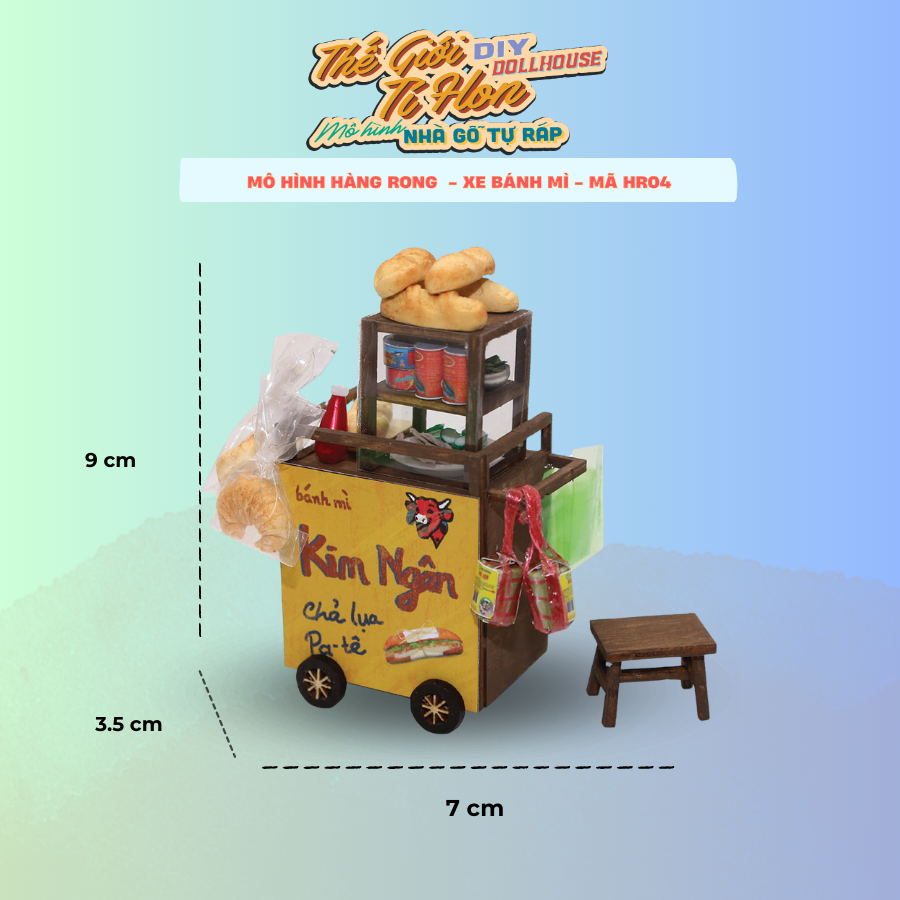 Khách lưu ý:  SẢN PHẨM TỰ SƠN VÀ LẮP RÁP SẢN PHẨM CHƯA BAO GỒM KEO DÁN CHUYÊN DỤNG, PIN VÀ DỤNG CỤ LẮP RÁP (NHÍP, DAO RỌC GIẤY, KÉO,...) SẢN PHẨM KHÔNG ÁP DỤNG ĐỔI TÊN BẢNG HIỆU GIÁ SẢN PHẨM CHƯA BAO GỒM THUẾ VAT, KHÁCH CẦN XUẤT VAT XIN VUI LÒNG LIÊN HỆ THẾ GIỚI TÍ HON QUA CHATBOX Mô Hình Xe Hàng Rong Sài Gòn Xưa Và Nay - Xe Bánh Mì - HR04 ** ĐƠN HÀNG XE HÀNG RONG KHÔNG ÁP DỤNG FREESHIP Bánh mì hầu như không còn xa lạ với mọi người, nhất là người Sài Gòn. Có lẽ vì nó là món có thể ăn bất kỳ lúc nào trong ngày, từ món điểm tâm sáng, bữa trưa, cho đến lót dạ lúc đêm khuya, nên khắp các con đường ngõ hẻm hầu như bạn đều thấy những xe bánh mì quen thuộc. Bánh mì cũng là một món ăn đơn giản và tiện lợi, chỉ mất dăm ba phút là đủ no bụng để người Sài Gòn tiếp tục hòa nhịp vào vòng xoáy của công việc... Mô hình Xe Bánh Mì Sài Gòn Thu Nhỏ - HR04 Tìm Hiểu Mô Hình Tí Hon Thông số mô hình Đánh giá độ khó Kích thước sản phẩm  7.0 x 3.5 x 9.0 CM (Dài x Rộng x Cao) Xuất xứ VIỆT NAM Cân nặng  0.2 Kg Nguyên vật liệu Gỗ, hoa cỏ khô, vải, giấy, kim loại, đèn Led, gốm sứ,nhựa,... Sản phẩm bao gồm Hộp Pin có công tắt, nguyên vật liệu lắp ráp, sách hướng dẫn.  Phụ kiện làm mô hình (Mua riêng): Keo chuyên dụng + Mica Che Bụi + Bộ dụng cụ Kit...()  Shop hỗ trợ lắp ráp luôn nếu bạn có nhu cầu (có phụ phí)