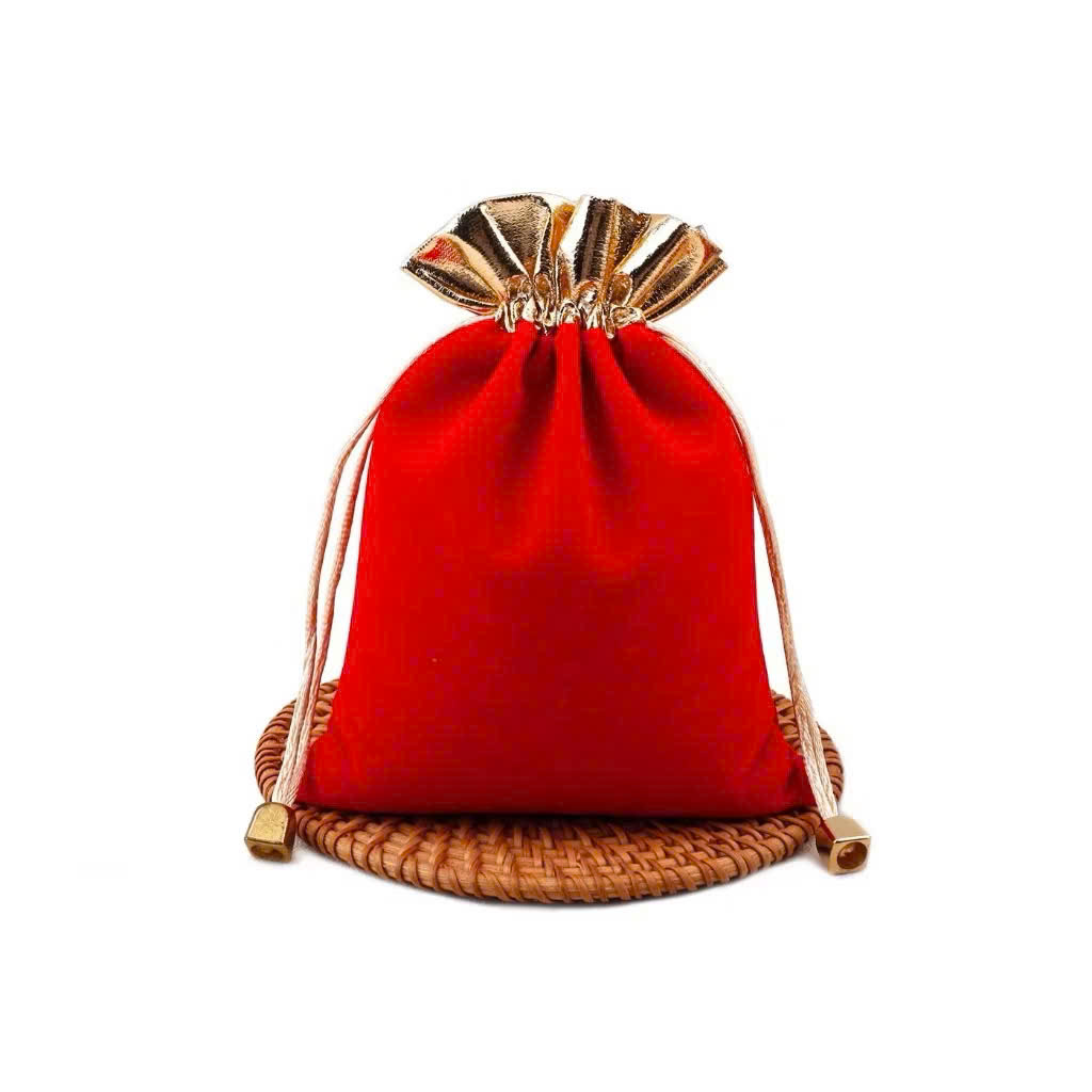 Túi nhung đỏ sang trọng đi kèm: may mắn dùng để đựng xu hoặc vật phẩm phong thủy, chất liệu túi bằng nhung đỏ, phần miệng túi bằng gấm màu vàng được phủ bằng kim tuyến màu vàng. Bên trong túi gấm chứa sản phẩm hình ông thần tài màu vàng, được bọc bảo vệ trong một lớp nhựa arylic.