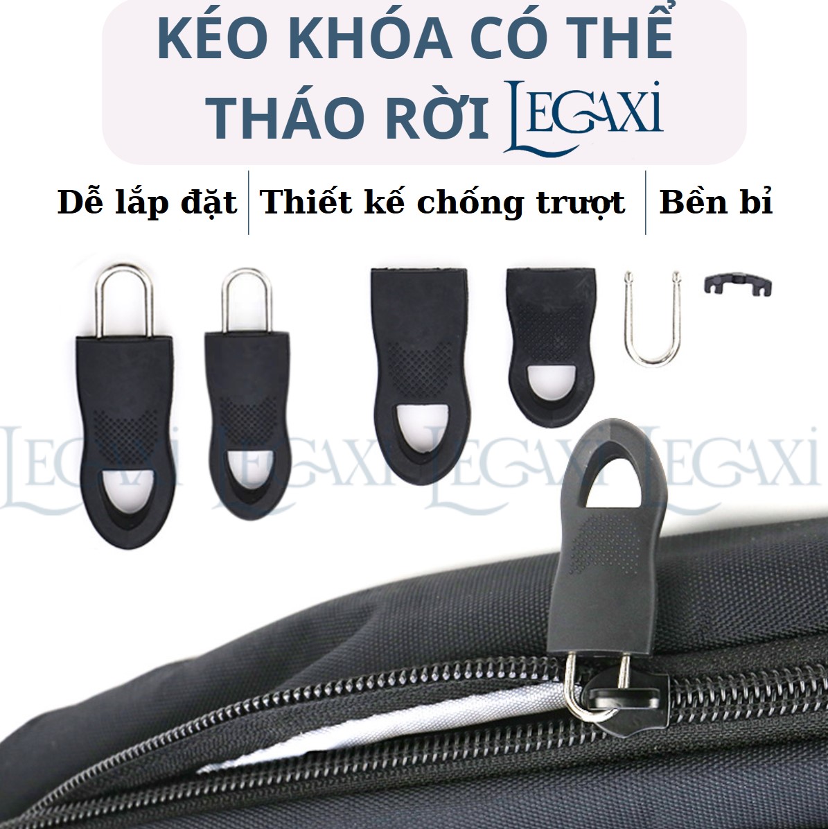 - Đầu khóa kéo có thể tháo rời và tái sử dụng cho nhiều sản phẩm khác nhau.