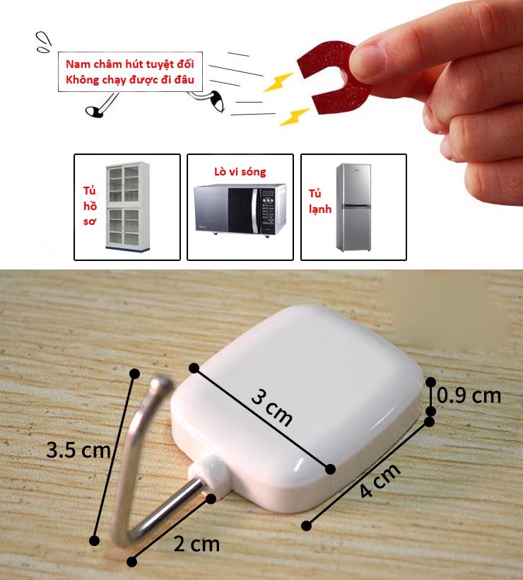 - Làm sạch bề mặt kim loại nơi cần treo móc, đặt móc nam châm dính vào. - Ấn thật chặt khoảng 30 giây, rồi để khoảng 1h sau mới có thể treo đồ vật
