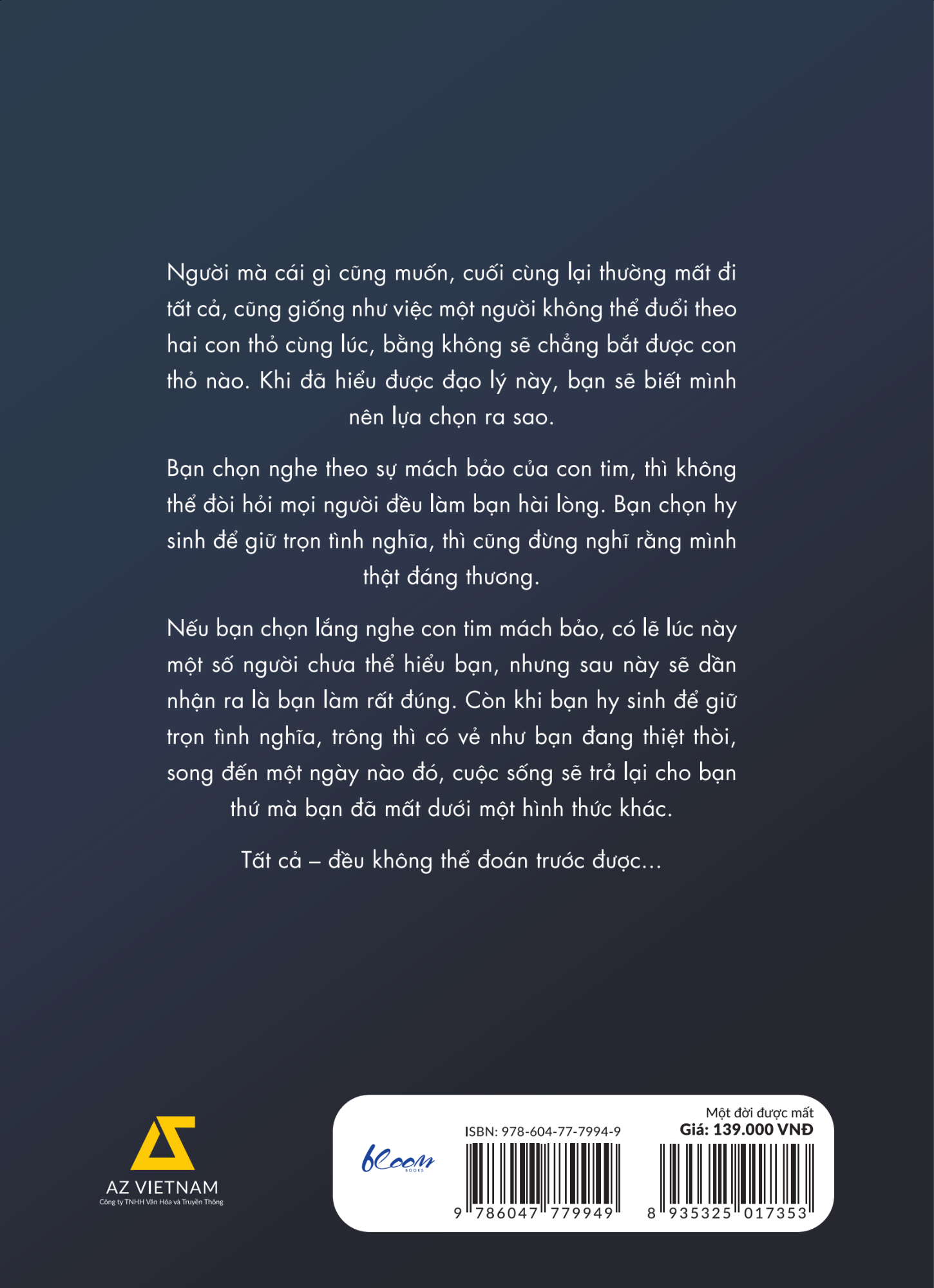 Mua tại TiktokThông tin sản phẩm Mã hàng 8935325017353 Tên Nhà Cung Cấp AZ Việt Nam Tác giả Vãn Tình Người Dịch Mỹ Linh NXB Thế Giới Năm XB 2023 Ngôn Ngữ Tiếng Việt Trọng lượng (gr) 340 Kích Thước Bao Bì 20 x 14.5 x 1.6 cm Số trang 322 Hình thức Bìa Mềm Một Đời Được Mất