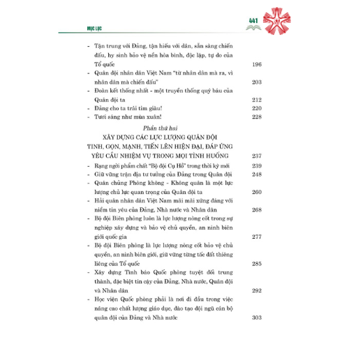 Phần thứ hai: Xây dựng các lực lượng quân đội tinh, gọn, mạnh, tiến lên hiện đại, đáp ứng yêu cầu nhiệm vụ trong mọi tình huống, gồm 18 bài viết, bài nói, bài phát biểu của Tổng Bí thư trong các chuyến thăm, làm việc với các lực lượng, đơn vị. Những chỉ đạo của đồng chí Tổng Bí thư rất sâu sát, cụ thể, gắn với từng chức năng, nhiệm vụ của đơn vị, chỉ rõ phương hướng, mục tiêu nhằm xây dựng các lực lượng của Quân đội tinh, gọn, mạnh, hiện đại, vừa đảm bảo tính thống nhất, hệ thống nhằm tăng cường khả năng phối hợp tác chiến hiệu quả, tăng cường khả năng dự báo, đủ sức răn đe, phòng ngừa, đảm bảo yêu cầu xây dựng và bảo vệ Tổ quốc trước những biến động mau lẹ của tình hình.
