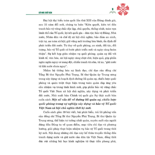Cuốn sách Một số vấn đề về đường lối quân sự, chiến lược quốc phòng trong sự nghiệp xây dựng và bảo vệ Tổ quốc Việt Nam xã hội chủ nghĩa thời kỳ mới của đồng chí Tổng Bí thư Nguyễn Phú Trọng, Bí thư Quân ủy Trung ương thể hiện tư tưởng, quan điểm, tư duy mang tầm chiến lược của đồng chí về định hướng đường lối xây dựng và bảo vệ Tổ quốc trong thời kỳ mới, về nhiệm vụ quân sự, quốc phòng trong giai đoạn đất nước đẩy mạnh công cuộc đổi mới, phát triển kinh tế - xã hội, hội nhập quốc tế ngày càng sâu rộng.