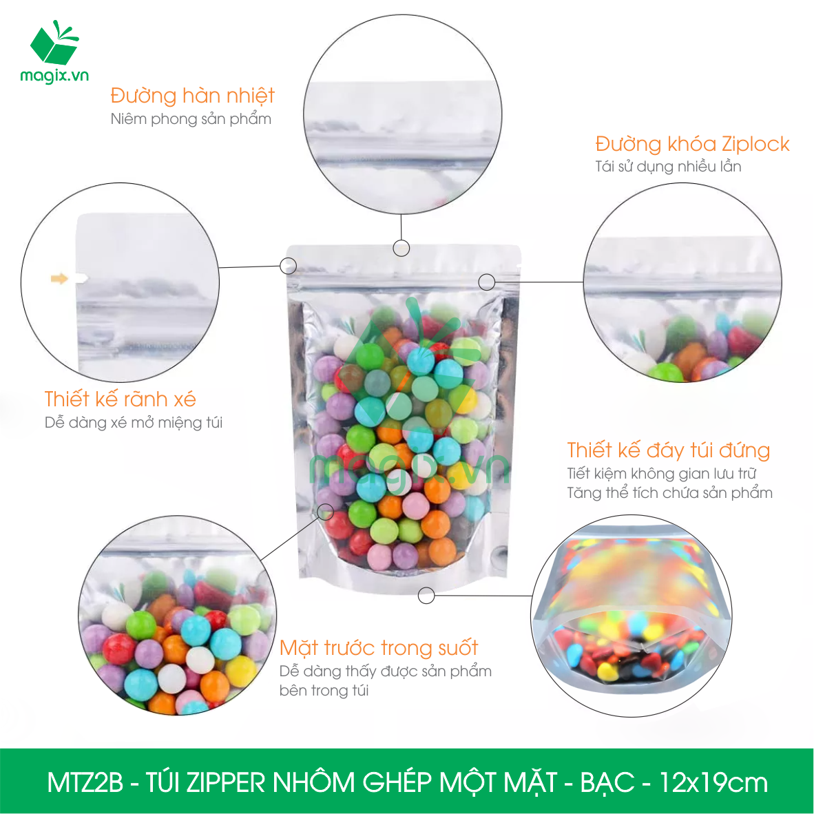 ✨MTZ2B - 12x19cm - Combo 50 Túi Zipper Bạc đáy đứng, một mặt trong