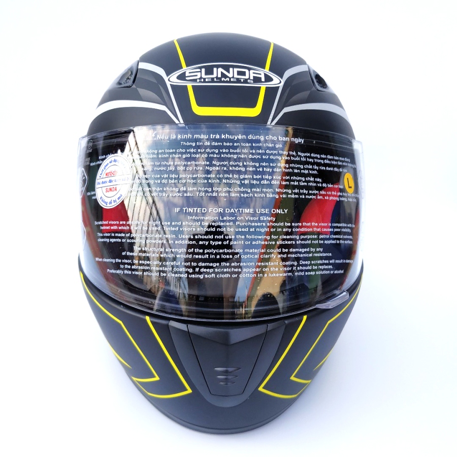 Mũ bảo hiểm fullface chính hãng Sunda 2000c đen nhám tem vàng là sản phẩm được cải tiến từ mẫu Andes/Sunda 2000A vốn được sản xuất để xuất khẩu phục vụ chủ yếu cho thị trường nước ngoài, nơi thường có form đầu lớn hơn người Việt Nam. Sunda 2000c được thiết kế đơn giản hơn, tinh giảm bớt 1 lỗ thông gió ở chính giữa của mũ, nhưng vẫn giữ 2 lỗ thông gió lớn 2 bên. Các lỗ thông gió bên trong lớp xốp để dẫn gió vào bên trong mũ được bố trí hợp lý xung quanh đầu đảm bảo người sử dụng luôn cảm thấy thoải mái nhất khi sử dụng kể cả khi phải di chuyển trong một thời gian dài. Nón được thiết kế nhỏ gọn hơn, lòng nón sâu, phù hợp với cỡ đầu phổ biến của người Việt Nam trưởng thành (Mũ chỉ có 1 size duy nhất). Nón cũng có màu sắc trang nhã hơn so với phiên bản gốc dành cho thị trường nước ngoài. Sunda 2000c là sản phẩm có độ bền cao, chịu được va đập tốt, thiết kế thời trang thông minh, bảo vệ an toàn trên mỗi hành trình của bạn. Sản phẩm giúp triệt tiêu ngoại lực tác động bên ngoài vào mũ, hạn chế tối đa tổn thương đến đầu khi có va chạm mạnh xảy ra. Mũ được thiết kế cho người đam mê tốc độ, có kính chắn gió rất tiện lợi và an toàn cho người đội. Kính được làm từ vật liệu chất lượng cao, đã qua xử lý đặc biệt, cho góc quan sát rộng, hình ảnh rõ nét, trung thực, không bị chói đèn, có khả năng chống tia UV, chắn gió, để bạn tập trung lái xe. Mũ bảo hiểm fullface Sunda 2000C tem với vỏ mũ được sản xuất từ chất liệu nhựa ABS có tính năng chịu va đập mạnh, lớp xốp bên trong mũ dày, vừa vặn bám chặt với phần vỏ giúp triệt tiêu hoàn toàn xung lực mạnh từ bên ngoài tác động vào, giảm chấn hiệu quả tối đa, ôm trọn vòng đầu. Do đó, bảo vệ tốt và giảm tối đa các chấn thương đầu khi không may xảy ra va chạm. Trọng lượng được phân tán đều, không gây cảm giác nặng và đau đầu, tạo cho người đội cảm giác thoải mái khi sử dụng. Phần xốp phía trong mũ dày làm bằng EPS 100% chính phẩm và được bọc bởi một lớp đệm êm, có khả năng hấp thu xung lực cao. Mũ sử dụng lớp vải lót kháng khuẩn, có khả năng thấm hút cao, giúp thoáng khí tốt, không gây ra các bệnh về da đầu và tóc. Ngoài ra, mũ còn được trang bị khóa inox chắc chắn và dây quai chịu lực cực mạnh, độ dài linh động phù hợp với nhiều người. Lớp lót mũ được thiết kế để có thể tháo lắp dễ dàng, nhanh chóng. Bạn có thể dễ dàng tháo rời lớp lót ra để giặt hoặc vệ sinh. Mũ thiết kế nhiều lỗ thông gió phía trước và sau mũ, các lỗ này có thể đóng mở được, đảm bảo bạn luôn cảm thấy thoải mái và dễ chịu khi sử dụng. Mũ có kiểu dáng thời trang cùng màu sắc tinh tế, trang nhã, thể hiện phong cách thời trang cá tính của bạn. Mũ phù hợp cho người có vòng đầu từ 55-59 cm - tương đương size L, thích hợp với người có vòng đầu trung bình.   Hướng dẫn xác định cỡ mũ phù hợp: Vòng 1 sợi dây quanh đầu, phía trên lông mày và tai khoảng 2cm. Xiết sợi dây sao cho ôm vừa đủ thoải mái lấy đầu và ghi lại số đo đó. Lặp lại như vậy để tìm được số đo mà bạn thấy đầu dễ chịu nhất. Đó chính là size đầu của bạn. So sánh với kích cỡ mũ để lựa chọn size mũ phù hợp. Thông tin về thương hiệu: