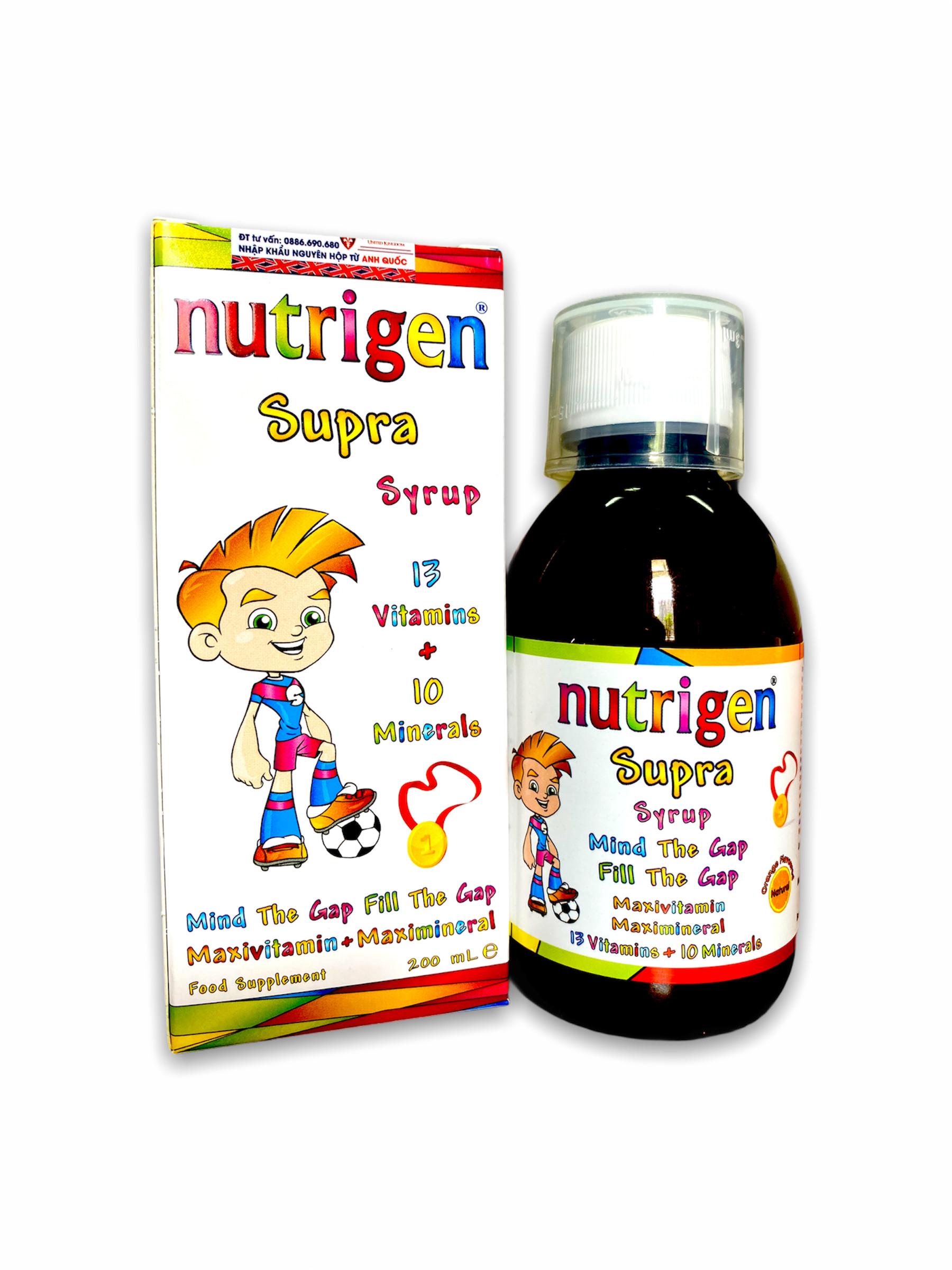 Giới thiệu Bữa ăn trong cuộc sống hiện đại có thể là nguyên do của việc trẻ hấp thu thiếu nhiều loại vitamin và khoáng chất, Nhiều chuyên gia về y học, dinh dưỡng và giáo dục cho rằng việc thiếu dinh dưỡng trong bữa ăn hằng ngày đã ảnh hưởng đến khả năng học vấn của trẻ em ở phương Tây. Khả năng học vấn tiến bộ thường đi đôi với chế độ dinh dưỡng được cải thiện tốt. Công thức độc nhất của Nutrigen Supra Maxivitamin Maximineral Syrup cung cấp đến 13 vitamin và 10 khoáng chất thiết yếu giúp tăng cường sự phát triển, giúp trẻ lớn khỏe mạnh và hỗ trợ các chức năng của cơ thể.  Thành phần Calci lactat, mononatri phosphat, magnesi sulfate, L-ascorbic acid (vitamin C), DL-alpha-tocopheryl acetat (vitamin E), kẽm sulfat monohydrat, niacinamid (vitamin B3), cholecalciferol (vitamin D3), calci D-pantothenat (vitamin B5), retinyl palmitat (vitamin A), mangan gluconat, đồng gluconat, pyridoxin hydroclorid (vitamin B6), riboflavin (vitamin B2), thiamin hydroclorid (vitamin B1), phytomenadion (vitamin K), acid folic, kali iod, crom clorid, natri selenit, natri molybdate, D-biotin, cyanocobalamin (vitamin B12). Thành phần khác: Nước khử ion, hương cam tự nhiên, beta-caroten, chất làm dày (natri carboxymethyl cellulose, xanthan gum), chất điều chỉnh acid (acid citric, trinatri citrat dihydrat), chất bảo quản (natri benzoat), chất tạo ngọt (sucralose). Công dụng Giúp bổ sung 13 vitamin và 10 khoáng chất cho cơ thể. Hỗ trợ tăng cường sức khỏe cho trẻ nhỏ. Đối tượng sử dụng Trẻ biếng ăn, gầy yếu, mệt mỏi, sức đề kháng kém, trẻ trong thời kỳ phát triển có nhu cầu bổ sung vitamin và khoáng chất. Hướng dẫn sử dụng Khuyến cáo hàng ngày: – Trẻ lớn hơn 3 tuổi: 15ml mỗi ngày. – Trẻ 2-3 tuổi: 10ml mỗi ngày. – Trẻ 1-2 tuổi: 10ml mỗi ngày – Trẻ 6 tháng- 12 tháng: 5ml mỗi ngày. Khuyến cáo Không sử dụng quá liều hàng ngày. Không sử dụng thay thế cho chế độ ăn bình thường. Không sử dụng cho người mẫn cảm với bất kì thành phần nào của sản phẩm, dầu cá, sữa, trứng và các loại hạt. Thực phẩm này không phải là thuốc và không có tác dụng thay thế thuốc chữa bệnh. Lắc kỹ trước khi dùng. NSX: Xem trên hộp. HSD: 36 tháng kể từ ngày sản xuất. HSD in trên hộp. Bảo quản: Nơi khô mát, tránh xa tầm tay trẻ em. Sau khi mở nắp, bảo quản trong ngăn mát tủ lạnh. Sử dụng trong vòng 06 tháng. Quy cách đóng gói: Hộp 1 lọ 200ml Xuất xứ: Vương Quốc Anh Nhà sản xuất: Vivatinell Ltd. Unit 138, Bradley Hall Trading Estate, Bradley Lane, Standish, Wigan, WN6 0XQ, Vương Quốc Anh Thương nhân chịu trách nhiệm về chất lượng: Công ty Cổ phần Dược phẩm AMVI (Amvipharm) Lô B14-3,4 đường N13, khu công nghiệp Đông Nam, Hòa Phú, Củ Chi, TP.HCM Số ĐKSP: 4246/2020/ĐKSP Số XNQC: 2177/2020/XNQC-ATTP