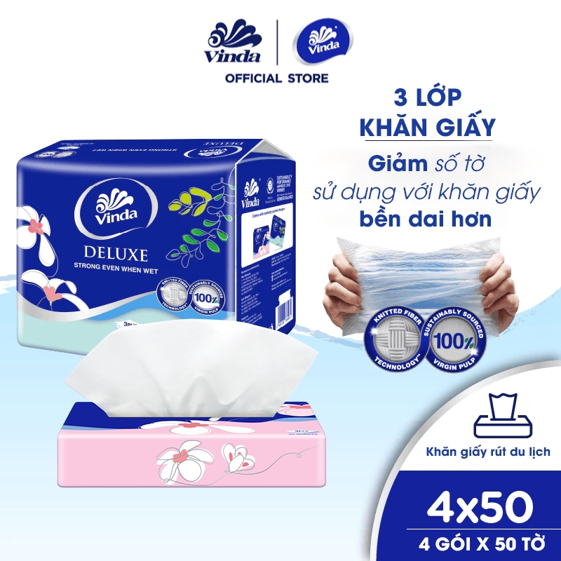 Câu chuyện thương hiệu:   Các gia đình Việt Nam đang ngày càng quan tâm sâu sắc hơn về các giải pháp chất lượng và an toàn dành cho toàn bộ mọi người trong gia đình đặc biệt là trẻ nhỏ. Họ mong muốn sản phẩm không chỉ hiệu quả mà còn mang đến chất lượng thoải mái để họ có thể yên tâm về sức khỏe cũng như sự an toàn cho các thành viên trong gia đình. Vinda thấu hiểu sâu sắc và luôn nỗ lực để đáp ứng yêu cầu thích đáng của khách hàng.  Vinda mong muốn trở thành một phần không thể thiếu trong các hoạt động thường nhật của gia đình bạn. Khăn giấy Vinda sẽ mang đến sự hiệu quả cũng giống như sự bền dai vượt trội ngay cả khi ướt thông qua công nghệ Knitted Fiber chuyên biệt, qua đó, để các gia đình luôn cảm giác an tâm và thoải mái trong mọi khoảnh khắc.   Giới thiệu sản phẩm:   Khăn giấy rút Vinda được làm từ bột giấy nguyên chất, không chứa hóa chất tẩy trắng độc hại, an toàn cho sức khỏe người dùng. Sản phẩm Vinda bền dai ngay cả khi ướt, không để lại vụn giấy khi sử dụng Thiết kế dạng rút tiện lợi giúp lấy giấy dễ dàng, hợp vệ sinh, phù hợp sử dụng trong gia đình, văn phòng, nhà hàng, trường học hoặc mang theo khi di chuyển. Phù hợp lý tưởng để vệ sinh cá nhân như lau tay, lau mặt, hoặc vệ sinh vật dụng cá nhân, bàn ăn hay các bề mặt khác. Ngoài ra, sản phẩm cũng thích hợp dùng trong các bữa ăn, đảm bảo an toàn thực phẩm và mang lại cảm giác sạch sẽ, dễ chịu.   Hạn sử dụng và quy cách: Hạn sử dụng: 3 năm kể từ ngày sản xuất. Ngày sản xuất: in trên gói theo năm/tháng/ngày   Quy cách:  Khăn giấy rút cao cấp Vinda Deluxe Size S Số lượng: 50 tờ 1 gói Số lớp: 3 lớp/ tờ Định lượng của 1 lớp giấy: 14 ± 1,0 gsm Kích thước: (140mm x 195mm) ± 5 mm Thành phần: 100% Bột giấy nguyên thủy. Bảo quản: Để nơi thoáng mát và tránh ánh nắng mặt trời