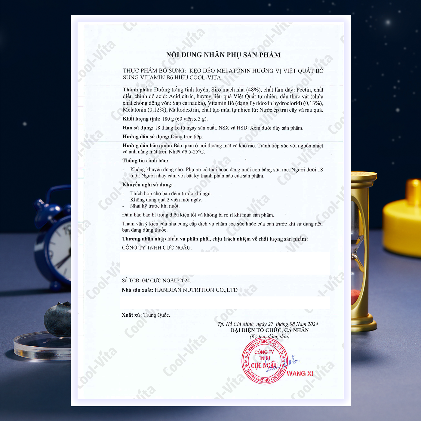 - (Tặng) 1 Hộp Nước Uống Collagen Cao Cấp Cool-Vita 3000mg Collagen Peptide (45ml× 7 túi)/hộp Bạn đang gặp khó khăn khi đi vào giấc ngủ? Vậy thì đừng nên bỏ qua Kẹo Dẻo Melatonin Vị Việt Quất của CoolVita! Kẹo Dẻo Melatonin CoolVita Vị Việt Quất Kết Hợp Vitamin B6 hỗ trợ điều chỉnh chu kỳ giấc ngủ và hỗ trợ cải thiện chất lượng giấc ngủ ngon hơn. Với 6mg melatonin trong mỗi 2 viên kẹo, kết hợp cùng vitamin B6 hỗ trợ giảm căng thẳng, có một đêm ngủ ngon và sâu hơn. Công dụng nổi bật: Hỗ trợ cải thiện chất lượng giấc ngủ: Mỗi 2 viên kẹo dẻo chứa 6mg Melatonin kết hợp Vitamin B6 hỗ trợ điều chỉnh chu kỳ giấc ngủ tự nhiên, giúp bạn dễ dàng đi vào giấc ngủ và duy trì giấc ngủ sâu suốt đêm. Hỗ trợ giúp thư giãn trước khi ngủ: Vitamin B6 giúp tạo cảm giác thư giãn trước khi ngủ, giúp cơ thể dễ dàng đi vào giấc ngủ. An toàn và lành mạnh: Kẹo Dẻo Melatonin CoolVita không phải là thuốc ngủ, hỗ trợ bạn ngủ ngon hơn. Nguyên liệu từ thực vật: Được làm bằng pectin từ thực vật thay vì gelatin, sản phẩm an toàn cho sức khỏe và phù hợp với chế độ ăn chay. Đặc điểm sản phẩm: Hương vị thơm ngon: Vị việt quất chua ngọt dễ chịu, kẹo dẻo mềm mịn, ngon miệng, không gây dính răng. Dễ sử dụng: Sản phẩm được chế biến thành dạng kẹo dẻo nhai tiện lợi. Tiện lợi mang theo: Hộp nhựa nhỏ gọn, dễ dàng mang theo khi đi công tác hoặc du lịch. Thành phần: Đường trắng tinh luyện, Siro mạch nha (48%), chất làm dày (Pectin), chất điều chỉnh độ acid: Acid citric, hương liệu quả việt quất tự nhiên, dầu thực vật (chứa chất chống đông vón: Sáp carnauba), Vitamin B6 (dạng Pyridoxin hydrochloric 0,13%), Melatonin (0,12%), Maltodextrin, chất tạo màu tự nhiên. Nước ép trái cây và rau quả. Khối lượng tịnh: 180g (60 viên x 3g) Hướng dẫn sử dụng: