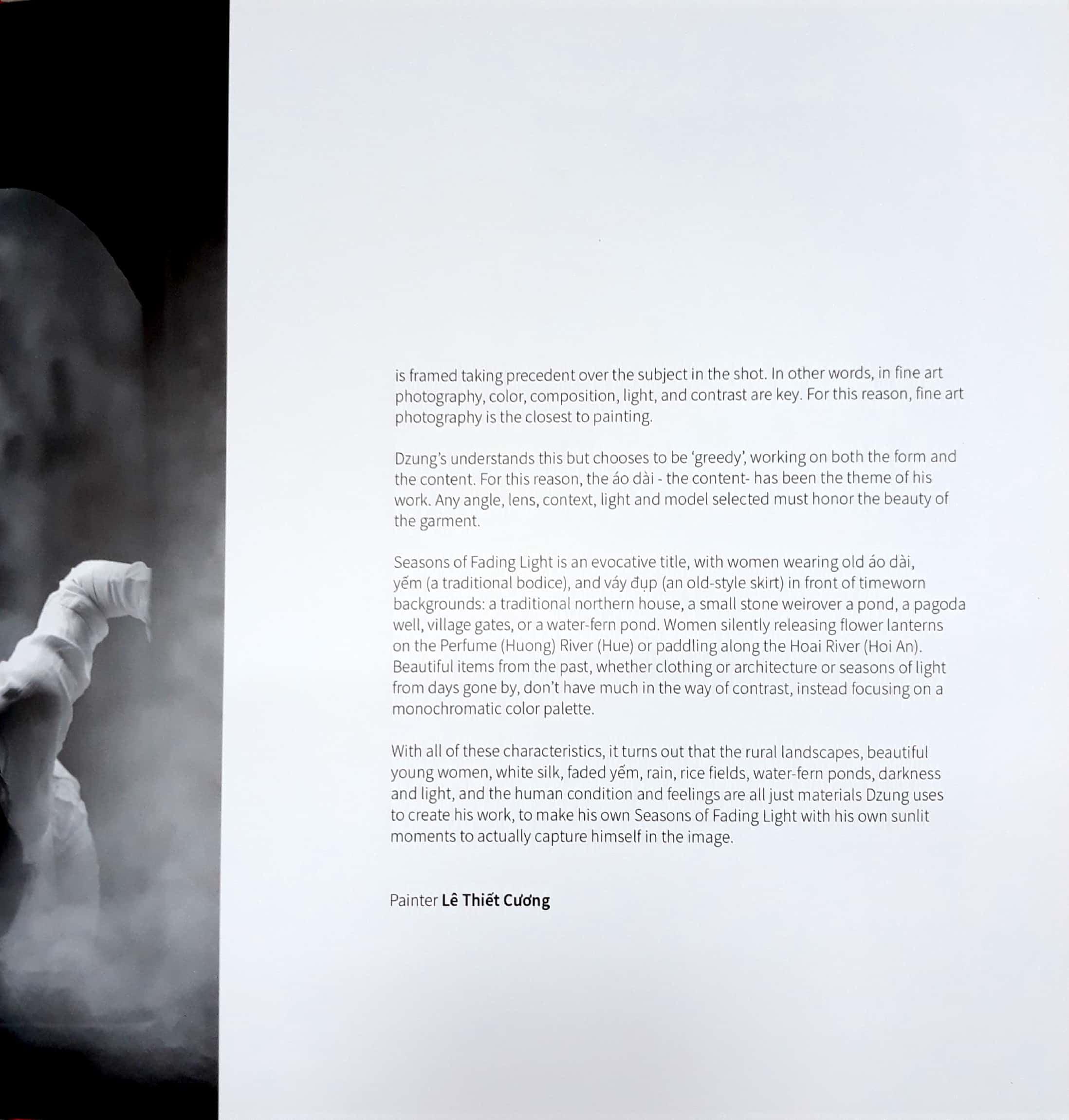 Trong những tác phẩm của mình, tác giả cũng hiểu điều này nhưng anh ấy vẫn muốn “tham lam”, vẫn muốn làm cả hai, cả hình thức và nội dung. Cho nên cái nội dung – áo dài được chọn là đề tài xuyên suốt. Mùa Nắng Phai, một cái tên gợi không thôi, những cô gái mặc áo dài cũ, yếm váy đụp cũ trên một bối cảnh cũ, nhà Bắc Bộ 3 gian 2 chái, cầu ao đá, giếng chùa, cổng làng, ao bèo; những vẻ đẹp cũ, không khí cũ yên bình, mùa nắng cũ hay mùa của thời gian đã qua… Hóa ra phong cảnh làng quê, những cô gái trẻ đẹp nõn nà, những lụa bạch, yếm phai, những cơn mưa, những đồng lúa, những ao bèo, những ánh sáng bóng tối, những thân phận, những nỗi niềm… cũng chỉ là nguyên liệu để tác giả làm mình, làm Mùa Nắng Phai của riêng mình.