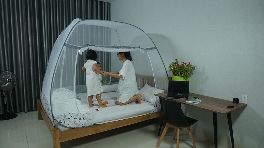 Kiểu dáng: Đỉnh rộng, có 2 cửa ra vào, có viền chân là từ vải nylon thay vì lưới mùng ( giúp bảo vệ 100% khi để tay chân chạm sát mùng)