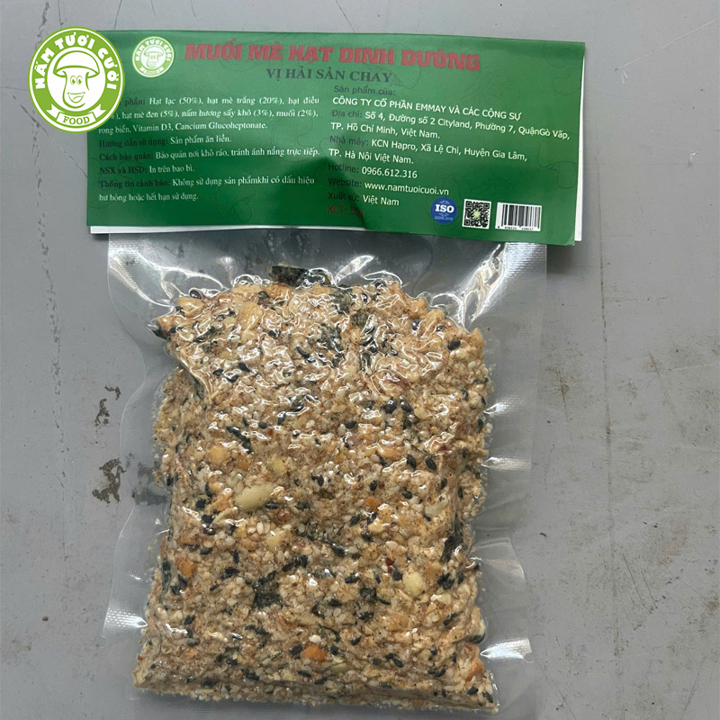 Mua tại TiktokMuối Mè Hạt Thuần Chay Vị Hải Sản Chay 50g Nấm Tươi Cười ️ THÔNG TIN SẢN PHẨM ️ Tên sản phẩm: Muối mè hạt vị Hải Sản Chay Thương hiệu: NẤM TƯƠI CƯỜI Khối lượng: 50g Quy cách đóng gói : Gói 50g Ngày Sản Xuất: in trên bao bì Hạn sử dụng: 3 tháng kể từ ngày sản xuất Sản phẩm được sản xuất và phân phối tại: Sản phẩm được sản xuất bởi Công Ty CP EMMAY VÀ CÁC CỘNG SỰ Xuất xứ : Việt Nam️ THÀNH PHẦN NGUYÊN LIỆU Hạt lạc 50%, hạt mè trắng 19%, hạt điều 18%, rong biển, hạt mè đen 5%, nấm hương sấy khô 3%, muối 2%, Vitamin D3, Cancium Glucoheptonate. ĐẶC ĐIỂM NỔI BẬT: ĐẶC BIỆT BỔ SUNG VITAMIN D3 TIÊU CHÍ 5 KHÔNG: