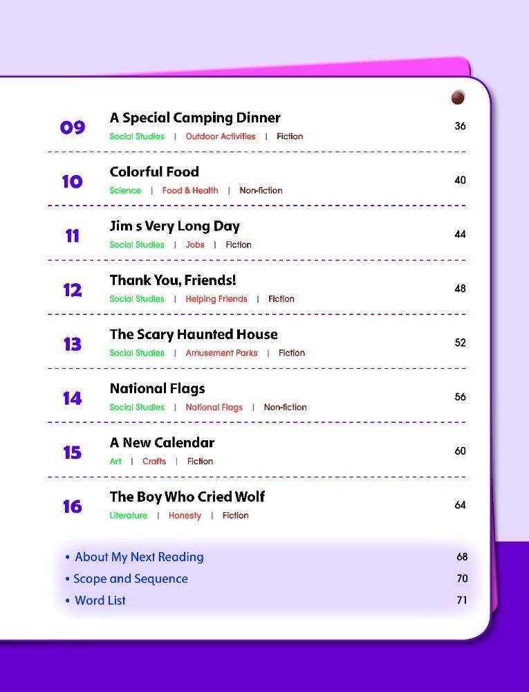 My Next Reading is a six-level reading series for young learners, using school subjects (Science, Social studies, Art, etc.) related topics for writing sentences and speaking with partners.