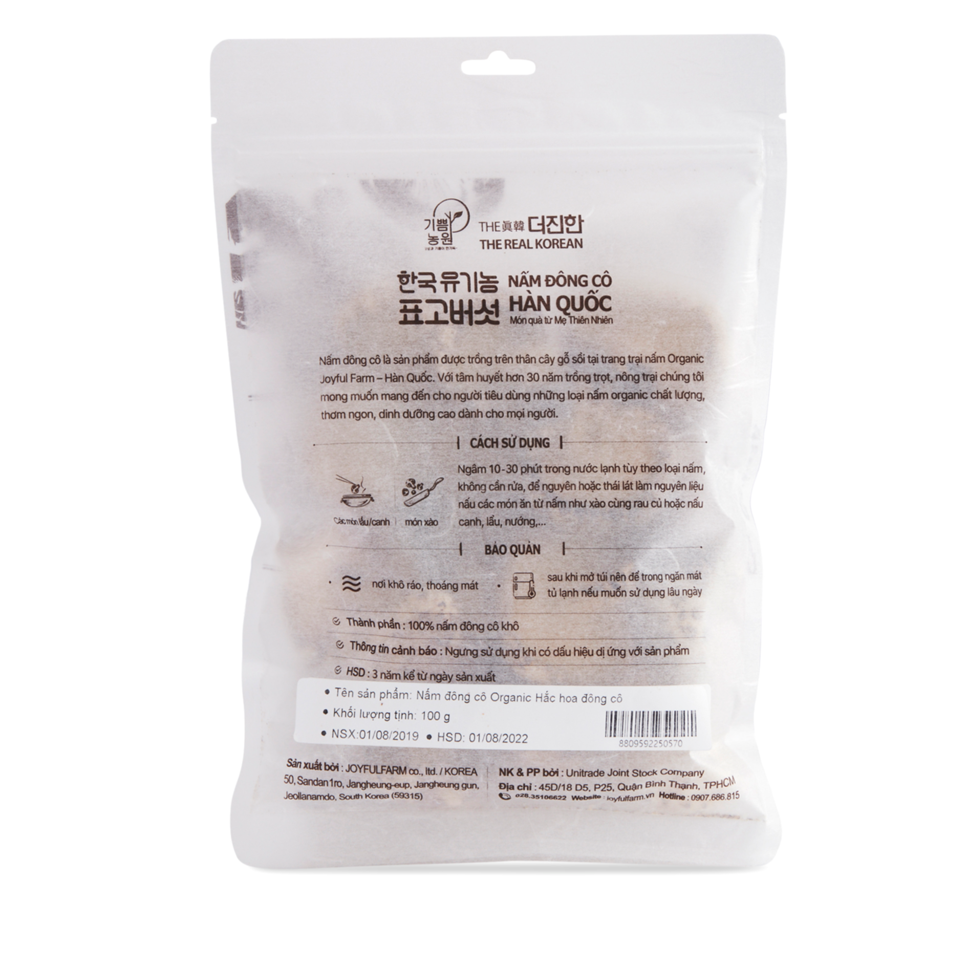 - NGUỒN GỐC, XUẤT XỨ: +Joyful Farm cung cấp Nấm đông cô khô Organic sản xuất và sấy khô tại Jangheung - Hàn Quốc, Đây là nơi có bầu không khí trong lành, nguồn nước